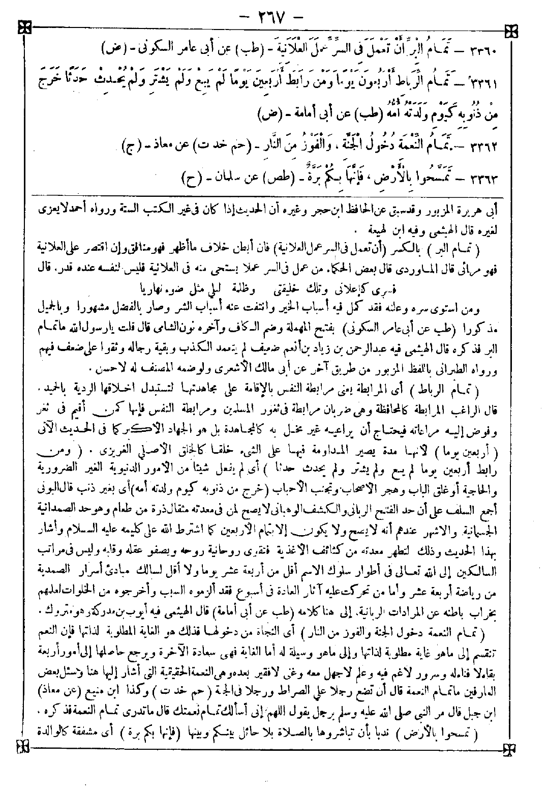 3361 - (تمام الرباط) أي المرابطة يعني مرابطة النفس بالإقامة على مجاهدتها لتستبدل أخلاقها الردية بالحميدة قال الراغب: المرابطة كالمحافظة وهي ضربان مرابطة في ثغور المسلمين ومرابطة النفس فإنها كمن أقيم في ثغر وفوض إليه مراعاته فيحتاج أن يراعيه غير مخل به كالمجاهدة بل هو الجهاد الأكبر كما في الحديث الآتي (أربعين يوما) لأنها مدة يصير المداومة فيها على الشيء خلقا كالخلق الأصلي الغريزي (ومن رابط أربعين يوما لم يبع ولم يشتر ولم يحدث حدثا) أي لم يفعل شيئا من الأمور الدنيوية الغير الضرورية والحاجية أو غلق الباب وهجر الأصحاب وتجنب الأحباب (خرج من ذنوبه كيوم ولدته أمه) أي بغير ذنب قال البوني: أجمع السلف على أن حد الفتح الرباني والكشف الوهباني لا يصح لمن في معدته مثقال ذرة من طعام وهو حد الصمدانية الجسمانية والأشهر عندهم أنه لا يصح ولا يكون إلا بتمام الأربعين كما اشترط الله على كليمه عليه السلام وأشار بهذا الحديث وذلك لتطهر معدته من كثائف الأغذية فتقوى روحانية روحه ويصفو عقله وقلبه وليس في مراتب السالكين إلى الله تعالى في أطوار سلوك الاسم أقل من أربعة عشر يوما ولا أقل لسالك مبادئ أسرار الصمدية من رياضة أربعة عشر وأما من تحركت عليه آثار العادة في أسبوع فقد ألزموه السبب وأخرجوه من الخلوات لعلمهم بخراب باطنه عن المرادات الربانية إلى هنا كلامه