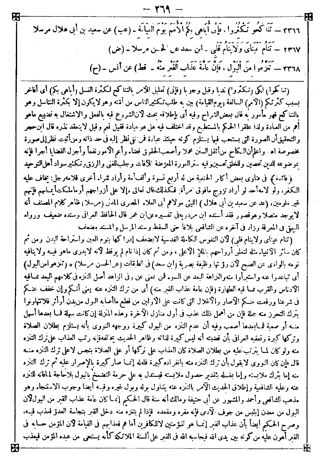 3368 - (تنزهوا من البول) أي تباعدوا عنه واستبرأوا منه والنزاهة البعد عن السوء فمن بمعنى عن وفي الزاهد أصل التنزه في كلامهم البعد مما فيه الأدناس والقرب مما فيه الطهارة (فإن عامة عذاب القبر منه) أي من ترك التنزه عنه يعني أنكم وإن خفف عنكم في شرعنا ورفعت عنكم الآصار والأغلال التي كانت على الأولين من قطع ما أصابه البول من بدن أو أثر فلا تتهاونوا بترك التحرز منه جملة فإن من أهمل ذلك عذب في أول منازل الآخرة وهذه المنزلة إن كانت سهلة فما بعدها أسهل منه أو صعبة فما بعدها أصعب وفيه أن عدم التنزه من البول كبيرة ووجهه النووي بأنه يستلزم بطلان الصلاة وتركها كبيرة وتعقبه العراقي بأن قضيته أنه ليس كبيرة لذاته وظاهر الحديث يخالفه فإنه رتب العذاب على ترك التنزه منه ولو كان لما يترتب عليه من بطلان الصلاة كان العذاب على تركها أو على الصلاة بنجس لا على ترك التنزه منه قال: فإن كان النووي لا يقول بأن ترك التنزه منه بانفراده كبيرة فلعله إنما صار كبيرة بالإصرار عليه ثم ترك التنزه منه إما بترك ملابسته وإما بغسله بتقدير حصول ملابسته فيستدل به على حرمة التضمخ بالبول بلا حاجة لمنافاته للتنزه عنه وعليه الشافعية وإطلاق الحديث الآمر بالتنزه عنه يتناول بوله وبول غيره وفيه أيضا وجوب الاستنجاء وهو مذهب الشافعي وأحمد والمشهور عن أبي حنيفة ومالك أنه سنة قال الحكيم: إنما كان عامة عذاب القبر من البول لأن البول من معدن إبليس من جوف الآدمي فإنه مقره ومقعده فإذا لم يتنزه منه دخل القبر بنجاسة العدو فعذب فيه وصرح الحكيم أيضا بأن عذاب القبر إنما هو للمؤمنين لا للكافرين أما هم فعذابهم في القيامة لأن المؤمن حسابه في القبر أهون عليه من كونه بين يدي الله فيحاسبه الله في القبر على ألسنة الملائكة كأنه يستحي من عبده المؤمن فيعذب -[270]- فيه ليخرج يوم القيامة طاهرا كما قال حذيفة في القبر حساب وفي الآخرة حساب فمن حوسب في القبر نجا ومن حوسب في الآخرة عذب إلى هنا كلامه وقال ابن عبد البر: الفتنة في القبر لا تكون إلا لمؤمن أو منافق من أهل القبلة ممن حقن الإسلام دمه وخالفهما عبد الحق وقال: بل تعم الكافر قال ابن سيد الناس: وفي إضافة عذاب القبر إلى البول خصوصية محضة دون جميع المعاصي مع العذاب بسبب غيره إن أراد الله في حق بعض عباده انتهى
