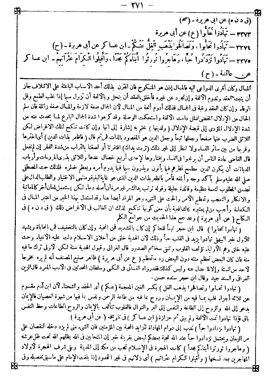 3373 - (تهادوا تحابوا) قال ابن حجر تبعا للحاكم إن كان بالتشديد فمن المحبة وإن كان بالتخفيف فمن المحاباة ويشهد للأول خبر البيهقي تهادوا يزيد في القلب حبا وذلك لأن الهدية خلق من أخلاق الإسلام دلت عليه الأنبياء وحث عليه خلق وهم الأولياء تؤلف القلوب وتنفي سخائم الصدور قال الغزالي: وقبول الهدية سنة لكن الأولى ترك ما فيه منة فإن كان البعض تعظم منته دون البعض رد ما تعظم