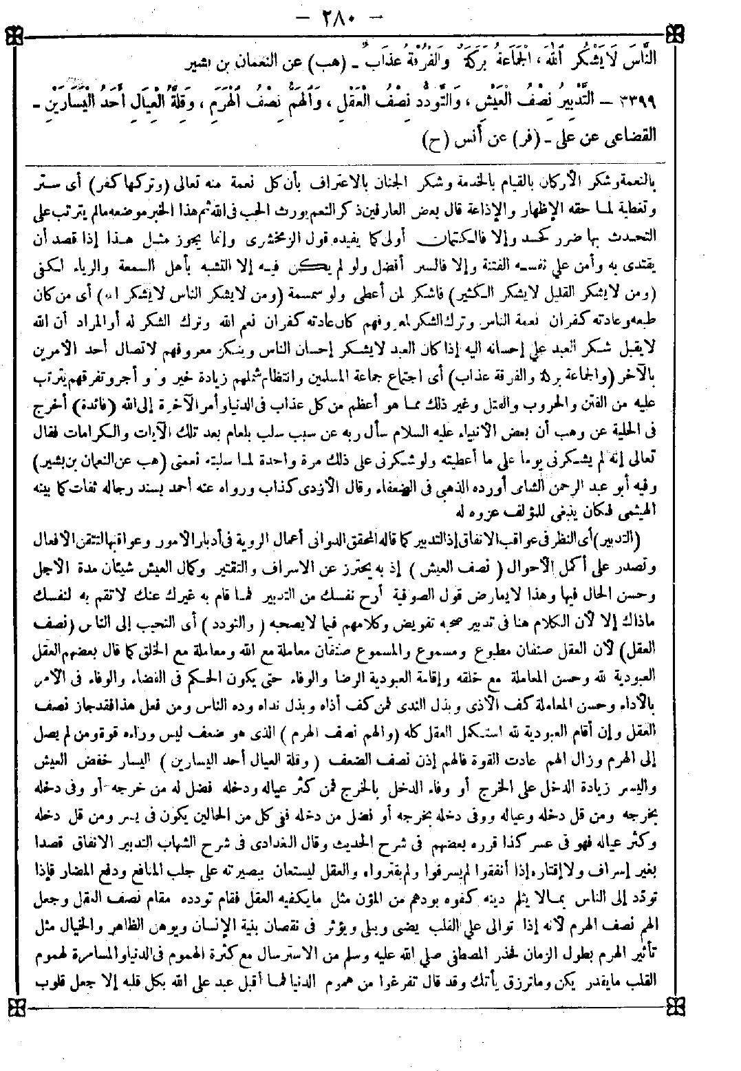 3399 - (التدبير) أي النظر في عواقب الإنفاق إذ التدبير كما قاله المحقق الدواني أعمال الروية في أدبار الأمور وعواقبها لتتقن الأفعال وتصدر على أكمل الأحوال (نصف المعيشة) إذ به يحترز عن الإسراف والتقتير وكمال العيش شيئان مدة الأجل وحسن الحال فيها وهذا لا يعارض قول الصوفية أرح نفسك من التدبير فما قام به غيرك عنك لا تقم به لنفسك ما ذاك إلا لأن الكلام هنا في تدبير صحبه تفويض وكلامهم فيما لا يصحبه (والتودد) أي التحبب إلى الناس (نصف العقل) لأن العقل صنفان مطبوع ومسموع والمسموع صنفان معاملة مع الله ومعاملة مع الخلق كما قال بعضهم: العقل العبودية لله وحسن المعاملة مع خلقه وإقامة العبودية الرضا والوفاء حتى يكون الحكم في القضاء والوفاء في الأمر بالأداء وحسن المعاملة كف الأذى وبذل الندى فمن كف أذاه وبذل نداه وده الناس ومن فعل هذا فقد جاز نصف العقل وإن أقام العبودية لله استكمل العقل كله (والهم نصف الهرم) الذي هو ضعف ليس وراءه قوة ومن لم يصل إلى الهرم وزال الهم عادت القوة فالهم إذن نصف الضعف (وقلة العيال أحد اليسارين) اليسار خفض العيش واليسر زيادة الدخل على الخرج أو وفاء الدخل بالخرج فمن كثر عياله ودخله فضل له من خرجه أو وفى دخله بخرجه ومن قل دخله وعياله ووفى دخله بخرجه أو فضل من دخله ففي كل من الحالين يكون في يسر ومن قل دخله وكثر عياله فهو في عسر كذا قرره بعضهم في شرح الحديث وقال البغدادي في شرح الشهاب: التدبير الإنفاق قصدا بغير إسراف ولا إقتار {إذا أنفقوا لم يسرفوا ولم يقتروا} والعقل ليستعان ببصيرته على جلب المنافع ودفع المضار فإذا تودد إلى الناس بما لا يثلم دينه كفوه بودهم من المؤن مثل ما يكفيه العقل فقام تودده مقام نصف العقل وجعل الهم نصف الهرم لأنه إذا توالى على القلب يضني ويبلي ويؤثر في نقصان بنية الإنسان ويوهن الظاهر والخيال مثل تأثير الهرم بطول الزمان فحذر المصطفى صلى الله عليه وسلم من الاسترسال مع كثرة الهموم في الدنيا والمسامرة لهموم القلب ما يقدر يكن وما ترزق يأتك وقد قال: تفرغوا من هموم الدنيا فما أقبل عبد على الله بكل قلبه إلا جعل قلوب -[281]- المؤمنين تفد إليه بالود والرحمة والله بكل خير أوسع وجعل خفة العيال أحد اليسارين لأن الغنى نوعان غنى بالشيء والمال وغنى عن الشيء لعدم الحاجة إليه وهذا هو الحقيقي فقلة العيال لا حاجة معها إلى كثرة المؤن قالوا: وهذا الحديث من جوامع الكلم