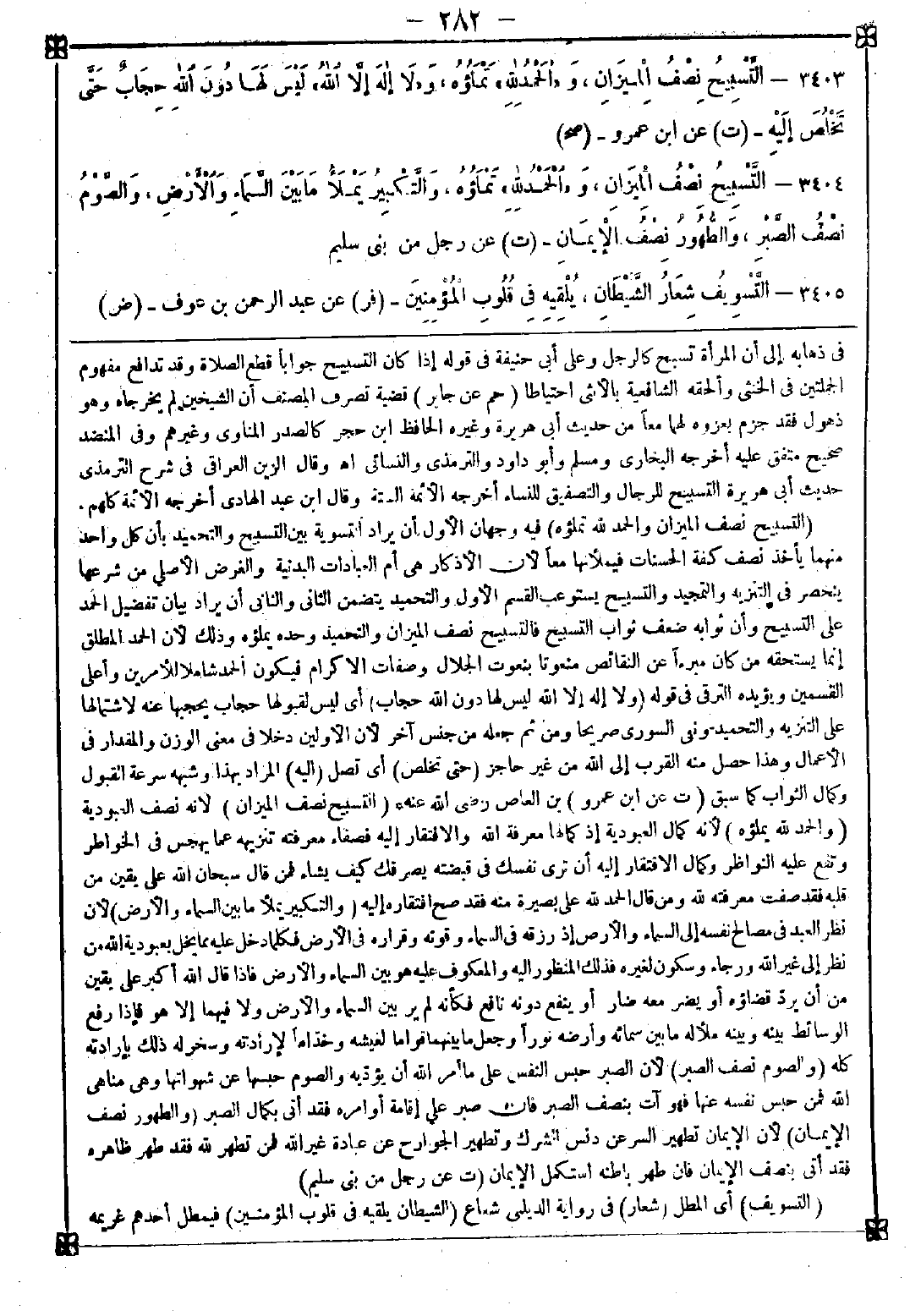 3404 - (التسبيح نصف الميزان) لأنه نصف العبودية (والحمد لله يملؤه) لأنه كمال العبودية إذ كمالها معرفة الله والافتقار إليه فصفاء معرفته تنزيهه عما يهجس في الخواطر وتقع عليه النواظر وكمال الافتقار إليه أن ترى نفسك في قبضته يصرفك كيف يشاء فمن قال سبحان الله على يقين من قلبه فقد صفت معرفته لله ومن قال الحمد لله على بصيرة منه فقد صح افتقاره إليه (والتكبير يملأ ما بين السماء والأرض) لأن نظر العبد في مصالح نفسه إلى السماء والأرض إذ رزقه في السماء وقوته وقراره في الأرض فكلما دخل عليه مما يخل بعبودية الله من نظر إلى غير الله ورجاء وسكون لغيره فذلك المنظور إليه والمعكوف عليه هو بين السماء والأرض فإذا قال الله أكبر على يقين من أن يرد قضاؤه أو يضر معه ضار أو ينفع دونه نافع فكأنه لم ير بين السماء والأرض ولا فيهما إلا هو فإذا رفع الوسائط بينه وبينه ملأ له ما بين سمائه وأرضه نورا وجعل ما بينهما قواما لعيشه وخداما لإرادته وسخر له ذلك بإرادته كله (والصوم نصف الصبر) لأن الصبر حبس النفس على ما أمر الله أن يؤديه والصوم حبسها عن شهواتها وهي مناهي الله فمن حبس نفسه عنها فهو آت بنصف الصبر فإن صبر على إقامة أوامره فقد أتى بكمال الصبر (والطهور نصف الإيمان) لأن الإيمان تطهير السر عن دنس الشرك وتطهير الجوارح عن عبادة غير الله فمن تطهر لله فقد طهر ظاهره فقد أتى بنصف الإيمان فإن طهر باطنه استكمل الإيمان