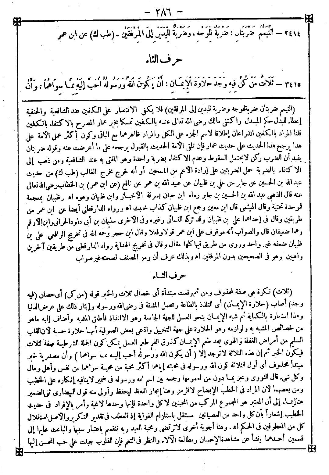 3415 - (ثلاث) نكرة هي صفة لمحذوف ومن ثم وقعت مبتدأة أي خصال ثلاث والخبر قوله (من كن) أي حصلن (فيه وجد) أصاب (حلاوة الإيمان) أي التلذذ بالطاعة وتحمل المشقة في رضى الله ورسوله وإيثار ذلك على عرض الدنيا وهذا استعارة بالكناية ثم شبه الإيمان بنحو العسل للجهة الجامعة وهو الالتذاذ فأطلق المشبه وأضاف إليه ما هو من خصائص المشبه به ولوازمه وهو الحلاوة على جهة التخييل وادعى بعض الصوفية أنها حلاوة حسية لأن القلب السليم من أمراض الغفلة والهوى يجد طعم الإيمان كذوق الفم طعم العسل يمكن كون الجملة الشرطية صفة لثلاث فيكون الخبر ثم إن هذه الثلاثة لا توجد إلا (أن يكون الله ورسوله أحب إليه مما سواهما) وأن مصدرية خبر مبتدأ محذوف أي أول الثلاثة كون الله ورسوله في محبته إياهما أكثر محبة من محبة سواهما من نفس وأهل ومال وكل شيء قال النووي: وعبر بما دون من لعمومها وجمعه بين اسم الله ورسوله في ضمير لا ينافيه إنكاره على الخطيب ومن يعصهما لأن المراد في الخطب الإيضاح لا الرمز وهنا إيجاز اللفظ ليحفظ وأولى منه قول البيضاوي ثنى الضمير هنا إيماء إلى أن المعتبر هو المجموع المركب من المحبتين لا كل واحدة فإنها وحدها لاغية وأمر بالإفراد في حديث الخطيب إشعارا بأن كل واحد من العصيانين مستقل باستلزام الغواية إذ العطف في تقدير التكرير والأصل استقلال كل من المعطوفين في الحكم اه. وهنا أجوبة أخرى لا ترتضى ومحبة العبد ربه تنقسم باعتبار سببها والباعث عليها إلى قسمين أحدهما ينشأ عن مشاهدة الإحسان ومطالعة الآلاء والنظر في النعم فإن القلوب جبلت على حب المحسن إليها -[287]- ولا إحسان أعظم من إحسان الرب تقدس وهذا القسم يدخل فيه كل أحد والثاني يتعلق بالخواص وهي محبة الجلال والجمال ولا شيء أكمل ولا أجمل منه فلا يجد كماله ولا يوصف جلاله ولا ينعت جماله وأسباب محبة رسول الله صلى الله عليه وسلم كثيرة منها أنه أنقذنا به من النار وأوجب لنا باتباعه الفلاح الأبدي والنعيم السرمدي (وأن يحب المرء لا يحبه إلا لله) أي لا يحبه لغرض إلا لغرض رضى الله حتى تكون محبته لأبويه لكونه سبحانه أمر بالإحسان إليهما ومحبته لولده لكونه ينفعه في الدعاء الصالح له وهكذا (وأن يكره أن يعود في الكفر) أي يصير إليه واستعمال العود بمعنى الصيرورة غير عزيز (بعد إذ انقذه الله منه) أي نحاه منه بالإسلام (كما يكره أن يلقى في النار) لثبوت إيمانه وتمكنه في جنانه بحيث انشرح صدره والتذ به وفيه تنبيه على الكفر كالنار وإشارة إلى التحلي بالفضائل وهو حب الله ورسوله وحب الخلق والتخلي عن الرذائل وهو كراهة الكفر وما يلزمه من النقائص وهو بالحقيقة لازم للأول إذ إرادة الكمال تستلزم كراهة النقصان فهو تصريح باللازم قال البيضاوي: جعل هذه الأمور الثلاثة عنوانا لكمال الإيمان المحصل لتلك اللذة لأنه لا يتم إيمان عبد حتى يتمكن في نفسه أن المنعم والقادر على الإطلاق هو الله وما مانح ولا مانع سواه وما عداه وسائط وأن الرسول هو العطوف الحقيقي الساعي في إصلاح شأنه وإعلاء مكانه وذلك يقتضي أن يتوجه بشراشره نحوه ولا يحب ما يحبه إلا لكونه وسطا بينه وبينه وإن تيقن أن جملة ما وعد به وأوعد حق فيتيقن أن الموعود كالواقع وقال البيضاوي: المراد بالحب العقلي الذي هو إيثار ما يقتضي العقل فالمرء لا يؤمن إلا إذا تيقن أن الشارع لا يأمر ولا ينهى إلا بما فيه صلاح عاجل أو خلاص آجل والعقل يقتضي ترجح جانبه وكماله بأن يمون نفسه بحيث يصير هواه تبعا لعقله ويلتذ به التذاذا عقليا إذ اللذة إدراك ما هو كمال وخير من حيث هو كذلك وليس بين هذه واللذة الحسية نسبة يعتل بها والشارع عبر عن هذه الخلة بالحلاوة لأنها أظهر من اللذات المحسوسة فيحسب مجالس الذكر رياض الجنة وأكل مال اليتيم أكل النار والعود إلى الكفر إلقاء في النار