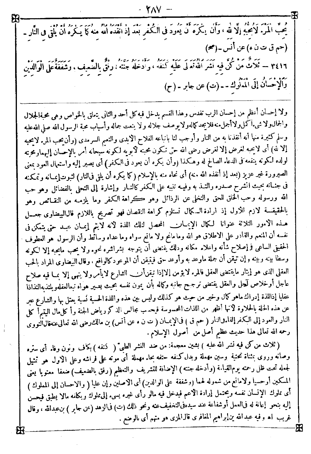 3416 - (ثلاث من كن فيه نشر الله عليه) بشين معجمة: من ضد النشر الطبي (كنفه) بكاف ونون وفاء أي ستره وصانه وروى بمثناة تحتية وسين مهملة وبدل كنفه حتفه بحاء مهملة أي موته على فراشه وعلى الأول هو تمثيل لجعله تحت ظل رحمته يوم القيامة (وأدخله جنته) الإضافة للتشريف والتعظيم (رفق بالضعيف) ضعفا معنويا يعني المسكين أو حسيا ولا مانع من شموله لهما (وشفقة على الوالدين) أي الأصلين وإن عليا (والإحسان إلى المملوك) أي مملوك الإنسان نفسه ويحتمل إرادة الأعم فيدخل فيه ما لو رأى غيره يسيء إلى مملوك ويكلفه ما لا يطيق فيحسن إليه بنحو إعانة له في العمل أو شفاعة عند سيده في التخفيف عنه ونحو ذلك