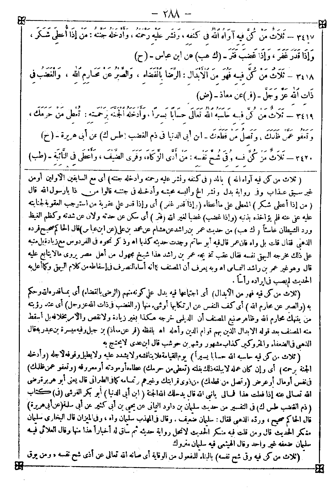 3418 - (ثلاث من كن فيه فهو من الأبدال) أي اجتماعها فيه يدل على كونه منهم (الرضى بالقضاء) أي بما قدره الله وحكم به (والصبر عن محارم الله) أي كف النفس عن ارتكابها أو شيء منها (والغضب في ذات الله عز وجل) أي عند رؤيته من ينتهك محارم الله وظاهر صنيع المصنف أن الديلمي خرجه هكذا بغير زيادة ولا نقص والأمر بخلافه بل أسقط منه المصنف بعد قوله الأبدال الذين بهم قوام الدين وأهله اه بلفظه