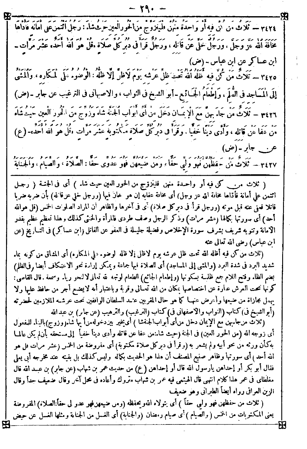 -[290]- 3424 - (ثلاث من كن فيه أو واحدة منهن فليتزوج من الحور العين حيث شاء) أي في الجنة (رجل ائتمن على أمانة فأداها مخافة الله عز وجل) أي مخافة عقابه إن هو خان فيها (ورجل خلى عن قاتله) بأن ضربه ضربا قاتلا فعفى عنه قبل موته (ورجل قرأ في دبر كل صلاة) أي في آخرها والظاهر أن المراد الصلوات الخمس (قل هو الله أحد) أي سورتها بكمالها (عشر مرات) وذكر الرجل وصف طردي فالمرأة والخنثى كذلك وهذا تعظيم عظيم بقدر الأمانة وتنويه شريف بشرف سورة الإخلاص وفضيلة جليلة في العفو عن القاتل