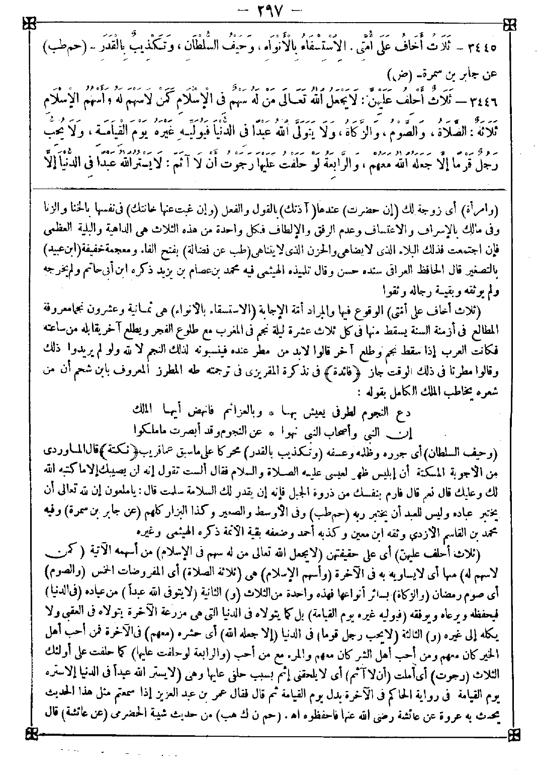 3445 - (ثلاث أخاف على أمتي) الوقوع فيها والمراد أمة الإجابة (الاستسقاء بالأنواء) هي ثمانية وعشرون نجما معروفة المطالع في أزمنة السنة يسقط منها في كل ثلاث عشرة ليلة نجم في المغرب مع طلوع الفجر ويطلع آخر يقابله من ساعته فكانت العرب إذا سقط نجم وطلع آخر قالوا: لا بد من مطر عنده فينسبونه لذلك النجم لا لله ولو لم يريدوا ذلك وقالوا: مطرنا في ذلك الوقت جاز. <فائدة> في تذكرة المقريزي في ترجمته طه المطرز المعروف بابن شحم أن من شعره يخاطب الملك الكامل بقوله: