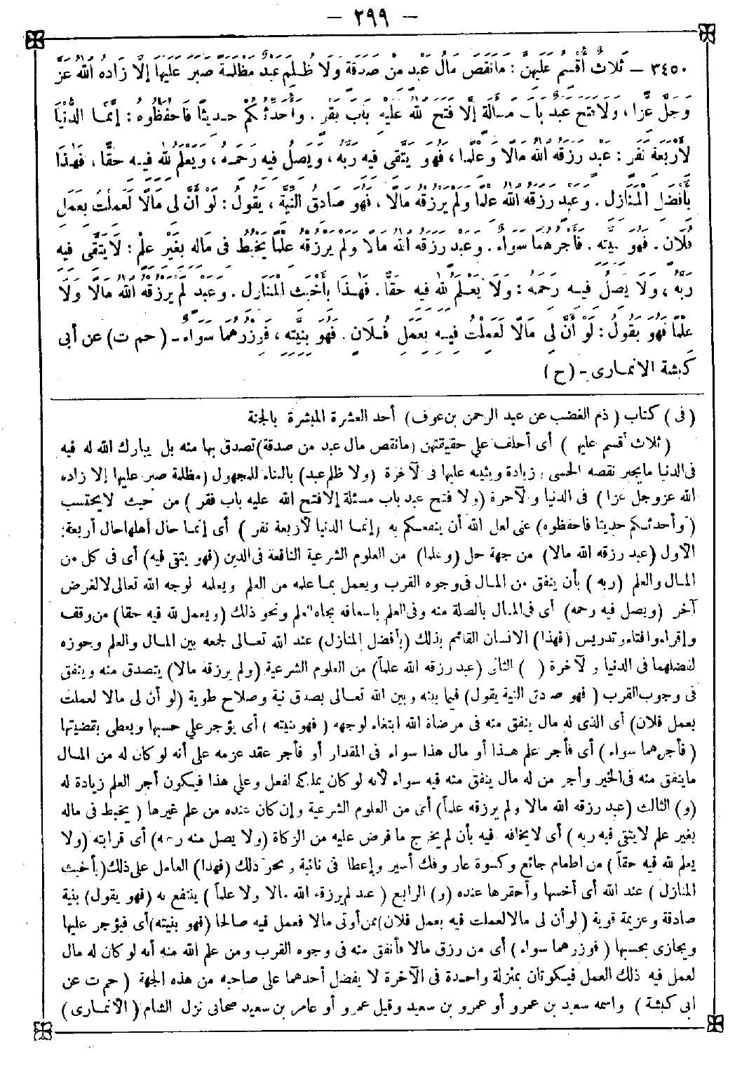 3450 - (ثلاث أقسم عليهن) أي أحلف على حقيقتهن (ما نقص مال عبد من صدقة) تصدق بها منه بل يبارك الله له فيه في الدنيا ما يجبر نقصه الحسي زيادة ويثيبه عليها في الآخرة (ولا ظلم عبد) بالبناء للمجهول (مظلمة صبر عليها إلا زاده الله عز وجل عزا) في الدنيا والآخرة (ولا فتح عبد باب مسألة إلا فتح الله عليه باب فقر) من حيث لا يحتسب (وأحدثكم حديثا فاحفظوه) عني لعل الله أن ينفعكم به (إنما الدنيا لأربعة نفر) أي إنما حال أهلها حال أربعة: الأول (عبد رزقه الله مالا) من جهة حل (وعلما) من العلوم الشرعية النافعة في الدين (فهو يتقي فيه) أي في كل من المال والعلم (ربه) بأن ينفق من المال في وجوه القرب ويعمل بما علمه من العلم ويعلمه لوجه الله تعالى لا لغرض آخر (ويصل فيه رحمه) أي في المال بالصلة منه وفي العلم بإسعافه بجاه العلم ونحو ذلك (ويعلم لله فيه حقا) من وقف وإقراء وإفتاء وتدريس (فهذا) الإنسان القائم بذلك (بأفضل المنازل) عند الله تعالى لجمعه بين المال والعلم وجوزه لفضلهما في الدنيا والآخرة (و) الثاني (عبد رزقه الله علما) من العلوم الشرعية (ولم يرزقه مالا) يتصدق منه وينفق في وجوب القرب (فهو صادق النية يقول) فيما بينه وبين الله تعالى بصدق نية وصلاح طوية (لو أن لي مالا لعملت بعمل فلان) أي الذي له مال ينفق منه في مرضاة الله ابتغاء لوجهه (فهو بنيته) أي يؤجر على حسبها ويعطى بقضيتها (فأجرهما سواء) أي فأجر علم هذا أو مال هذا سواء في المقدار أو فأجر عقد عزمه على أنه لو كان له من المال ما ينفق منه في الخير وأجر من له مال ينفق منه فيه سواء لأنه لو كان يملكه لفعل وعلى هذا فيكون أجر العلم زيادة له (و) الثالث (عبد رزقه الله مالا ولم يرزقه علما) أي من العلوم الشرعية وإن كان عنده من علم غيرها (يخبط في ماله بغير علم لا يتقي فيه ربه) أي لا يخافه فيه بأن لم يخرج ما فرض عليه من الزكاة (ولا يصل منه رحمه) أي قرابته (ولا يعلم لله فيه حقا) من إطعام جائع وكسوة عار وفك أسير وإعطاء في نائبة ونحو ذلك (فهذا) العامل على ذلك (بأخبث المنازل) عند الله أي أخسها وأحقرها عنده (و) الرابع (عبد لم يرزقه الله مالا ولا علما) ينتقع به (فهو يقول) بنية صادقة وعزيمة قوية (لو أن لي مالا لعملت فيه بعمل فلان) ممن أوتي مالا فعمل فيه صالحا (فهو بنيته) أي فيؤجر عليها ويجازي بحسبها (فوزرهما سواء) أي من رزق مالا فأنفق منه في وجوه القرب ومن علم الله منه أنه لو كان له مال لعمل فيه ذلك العمل فيكونان بمنزلة واحدة في الآخرة لا يفضل أحدهما على صاحبه من هذه الجهة