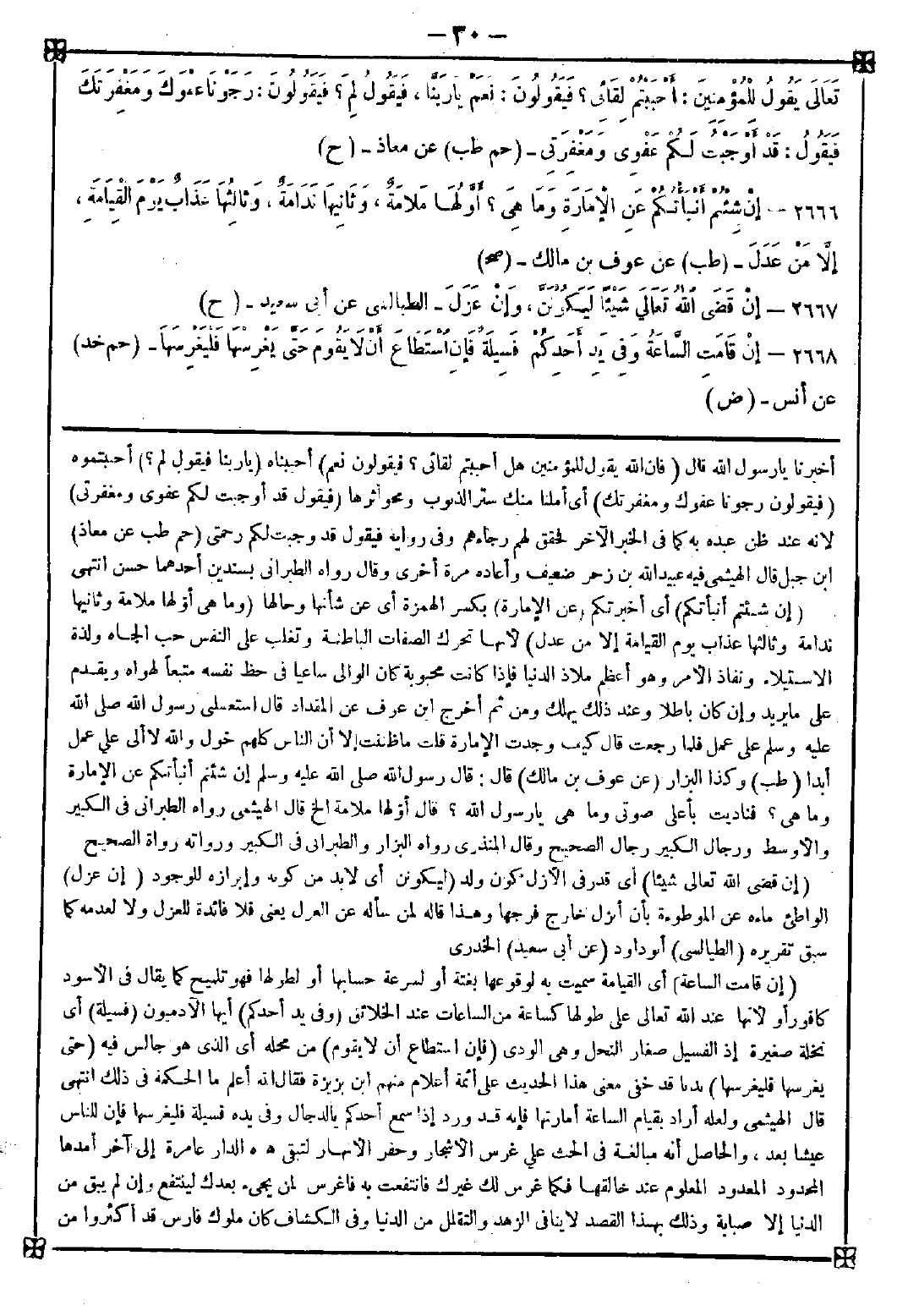 2666 - (إن شئتم أنبأتكم) أي أخبرتكم (عن الإمارة) بكسر الهمزة أي عن شأنها وحالها (وما هي أولها ملامة وثانيها ندامة وثالثها عذاب يوم القيامة إلا من عدل) لأنها تحرك الصفات الباطنة وتغلب على النفس حب الجاه ولذة الاستيلاء ونفاذ الأمر وهو أعظم ملاذ الدنيا فإذا كانت محبوبة كان الوالي ساعيا في حظ نفسه متبعا لهواه ويقدم على ما يريد وإن كان باطلا وعند ذلك يهلك ومن ثم أخرج ابن عوف عن المقداد قال: استعملني رسول الله صلى الله عليه وسلم على عمل فلما رجعت قال: كيف وجدت الإمارة قلت: ما ظننت إلا أن الناس كلهم خول والله لا آلي على عمل أبدا