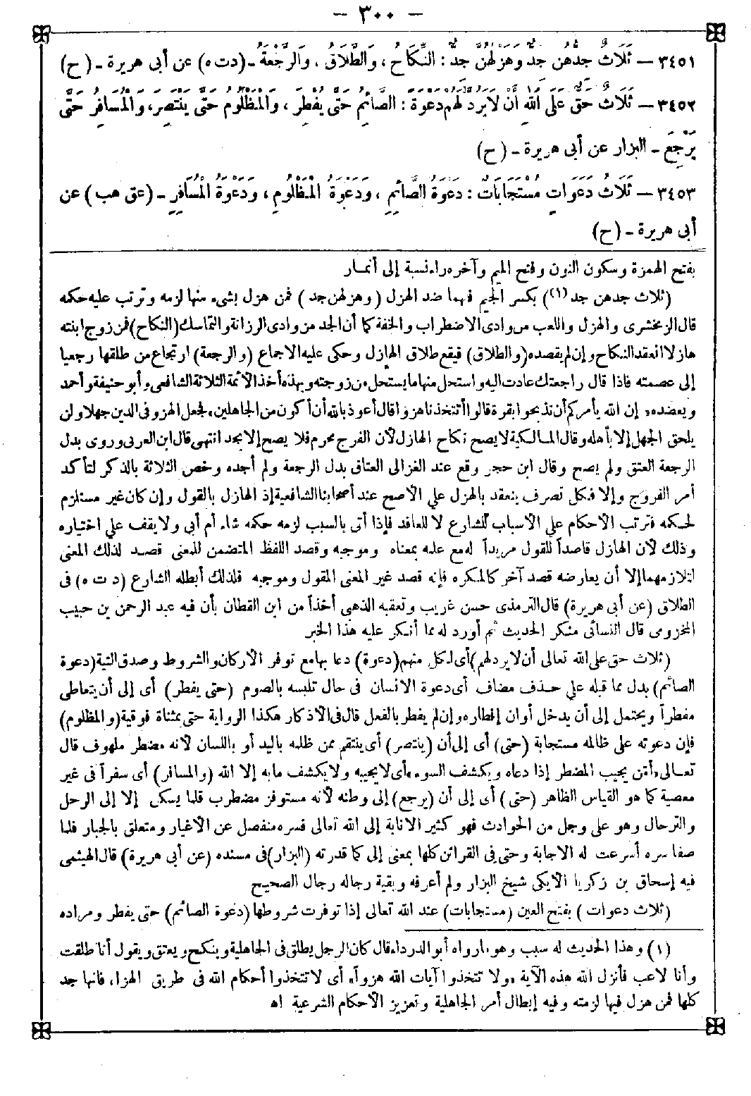 (1) وهذا الحديث له سبب وهو ما رواه أبو الدرداء قال: كان الرجل يطلق في الجاهلية وينكح ويعتق ويقول أنا طلقت وأنا لاعب فأنزل الله هذه الآية {ولا تتخذوا آيات الله هزوا} أي لا تتخذوا أحكام الله في طريق الهزاء فإنها جد كلها فمن هزل فيها لزمته وفيه إبطال أمر الجاهلية وتعزيز الأحكام الشرعية اه