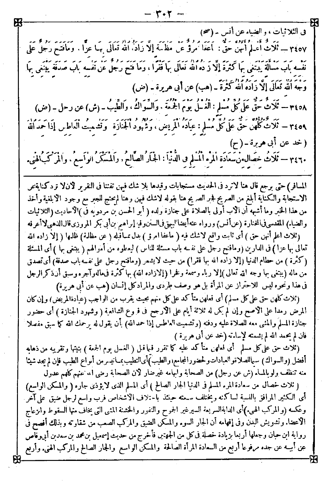 3458 - (ثلاث حق على كل مسلم) أي فعلهن متأكد عليه كما تقرر فيما قبل (الغسل يوم الجمعة) بنيتها وتقريبه من ذهابه أفضل (والسواك) سيما للصلاة والعبادات ولحضور المجامع (والطيب) أي التطيب بما تيسر من أنواع الطيب فإن لم يجد شيئا منه تنظف ولو بالماء