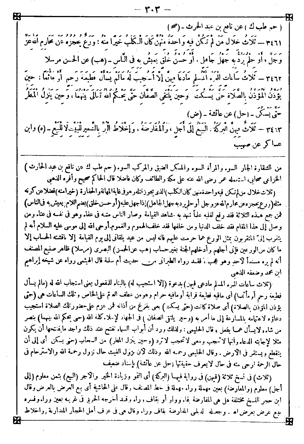 3461 - (ثلاث خلال من لم تكن فيه واحدة منهن كان الكلب) الذي يجوز قتله وهو في غاية المهانة والحقارة (خيرا منه) فضلا عن كونه مثله (ورع يحجزه عن محارم الله عز وجل أو حلم يرد به جهل الجاهل) إذا جهل عليه (أو حسن خلق) بضم اللام (يعيش به في الناس) فمن جمع هذه الثلاثة فقد رفع لقلبه علما شهد به مشاهد القيامة وصار الناس منه في عفاء وهو في نفسه في عناء ومن وصل إلى هذا المقام فقد خلف الدنيا ومن خلفها فقد خلف الهموم والغموم أوحى الله إلى موسى عليه السلام أنه لم يتقرب إلي المتقربون بمثل الورع عما حرمت عليهم فإنه ليس من عبد يلقاني إلى يوم القيامة إلا ناقشته الحساب إلا ما كان من الورعين فإني أجلهم وأدخلهم الجنة بغير حساب