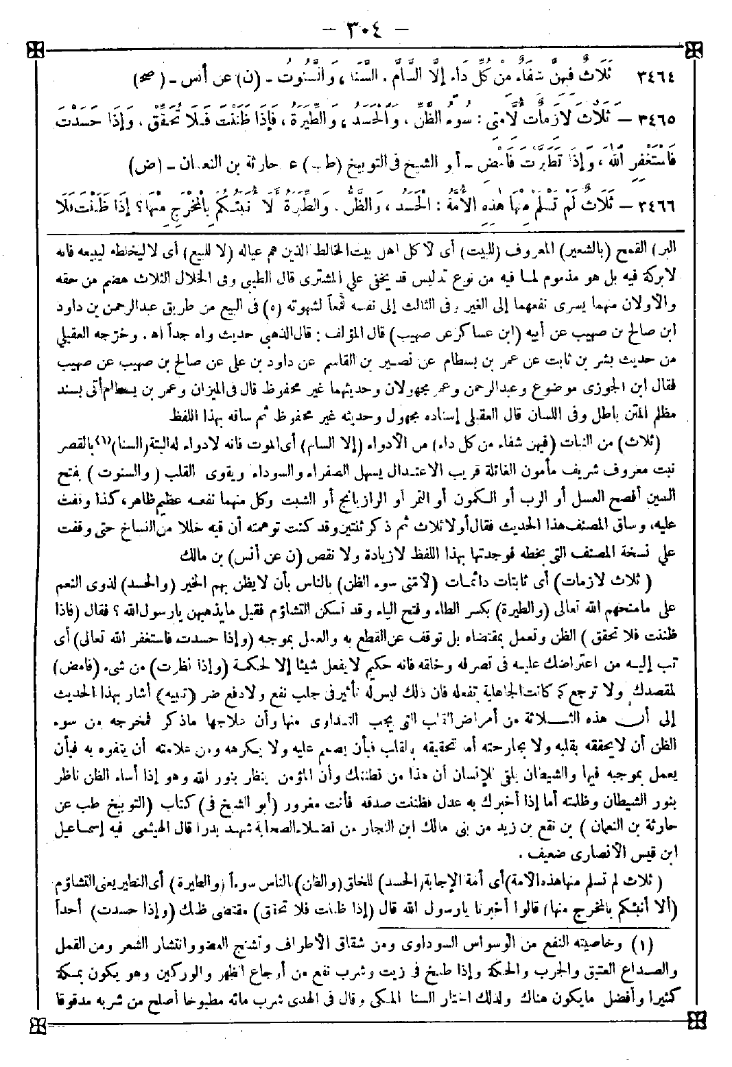 3464 - (ثلاث) من النبات (فيهن شفاء من كل داء) من الأدواء (إلا السام) أي الموت فإنه لا دواء له البتة (السنا) (1) بالقصر نبت معروف شريف مأمون الغائلة قريب الاعتدال يسهل الصفراء والسوداء ويقوي القلب (والسنوت) بفتح السين أفصح العسل أو الرب أو الكمون أو التمر أو الرازبانج أو الشبت وكل منهما نفعه عظيم ظاهر كذا وقفت عليه وساق المصنف هذا الحديث فقال أولا ثلاث ثم ذكر ثنتين وقد كنت توهمته أن فيه خللا من النساخ حتى وقفت على نسخة المصنف التي بخطه فوجدتها بهذا اللفظ لا زيادة ولا نقص