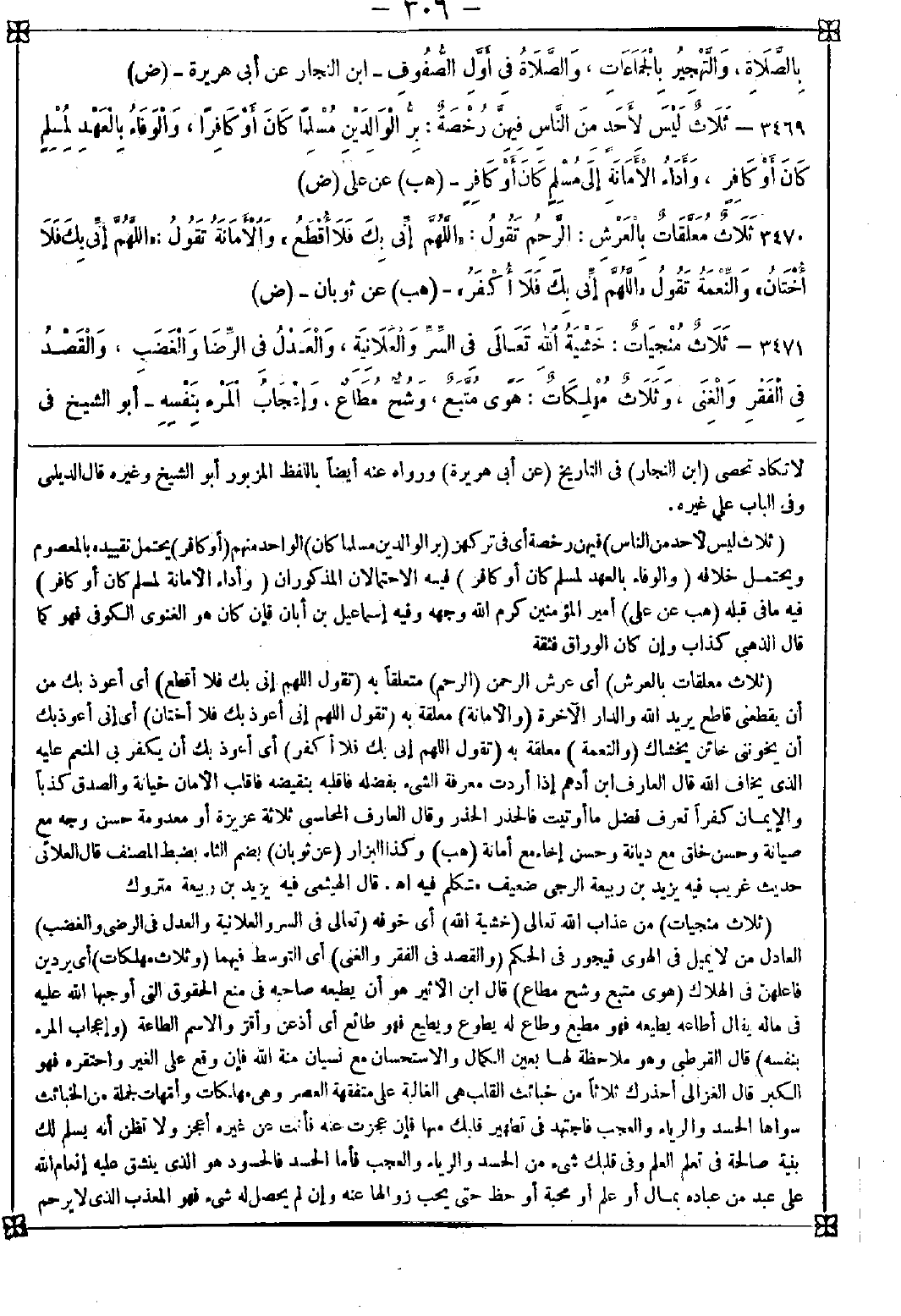 3471 - (ثلاث منجيات) من عذاب الله تعالى (خشية الله) أي خوفه (تعالى في السر والعلانية والعدل في الرضى والغضب) العادل من لا يميل في الهوى فيجور في الحكم (والقصد في الفقر والغنى) أي التوسط فيهما (وثلاث مهلكات) أي يردين فاعلهن في الهلاك (هوى متبع وشح مطاع) قال ابن الأثير: هو أن يطيعه صاحبه في منع الحقوق التي أوجبها الله عليه في ماله يقال أطاعه يطيعه فهو مطيع وطاع له يطوع ويطيع فهو طائع أي أذعن وأقر والاسم الطاعة (وإعجاب المرء بنفسه) قال القرطبي: وهو ملاحظة لها بعين الكمال والاستحسان مع نسيان منة الله فإن وقع على الغير واحتقره فهو الكبر قال الغزالي: أحذرك ثلاثا من خبائث القلب هي الغالبة على متفقهة العصر وهي مهلكات وأمهات لجملة من الخبائث سواها الحسد والرياء والعجب فاجتهد في تطهير قلبك منها فإن عجزت عنه فأنت عن غيره أعجز ولا تظن أنه يسلم لك بنية صالحة في تعلم العلم وفي قلبك شيء من الحسد والرياء والعجب فأما الحسد فالحسود هو الذي ينشق عليه إنعام الله على عبد من عباده بمال أو علم أو محبة أو حظ حتى يحب زوالها عنه وإن لم يحصل له شيء فهو المعذب الذي لا يرحم -[307]- فلا يزال في عذاب فالدنيا لا تخلو عن كثير من أقرانه فهو في عذاب في الدنيا إلى موته ولعذاب الآخرة أشد وأكبر وأما الهوى المتبع فهو طلبك المنزلة في قلوب الخلق لتنال الجاه والحشمة وفيه هلك أكثر الناس وأما العجب فهو الداء العضال وهو نظر العبد إلى نفسه بعين العز والاستعظام ونظره لغيره بعين الاحتقار وثمرته أن يقول أنا وأنا كما قال إبليس ونتيجته في المجالس التقدم والترفع وطلب التصدر وفي المحاورة الاستنكاف من أن يرد كلامه وذلك مهلك للنفس في الدنيا والآخرة قال الزمخشري: الإعجاب هو فتنة العلماء وأعظم بها من فتنة وقال في العوارف: وما نقل عن جمع كبار من كلمات مؤذنة بالإعجاب فهو بسقيا السكر وانحصارهم في مضيقه وعدم خروجهم لفضاء الفقر في ابتداء أمرهم فإنه إذا حدق صاحب البصيرة نظره علم أنه من استراق النفس قال عند نزول الوارد على القلب والنفس عند الاستراق المذكور تظهر بصفتها فتصدر عنها تلك الكلمات كقول بعضهم ما تحت خضر السماء مثلي وقول بعضهم أسرجت وألجمت وطفت في أقطار الأرض وقلت هل من مبارز فلم يخرج إلي أحد فهذا كله يطفح عليهم حال السكر فيحتمل
