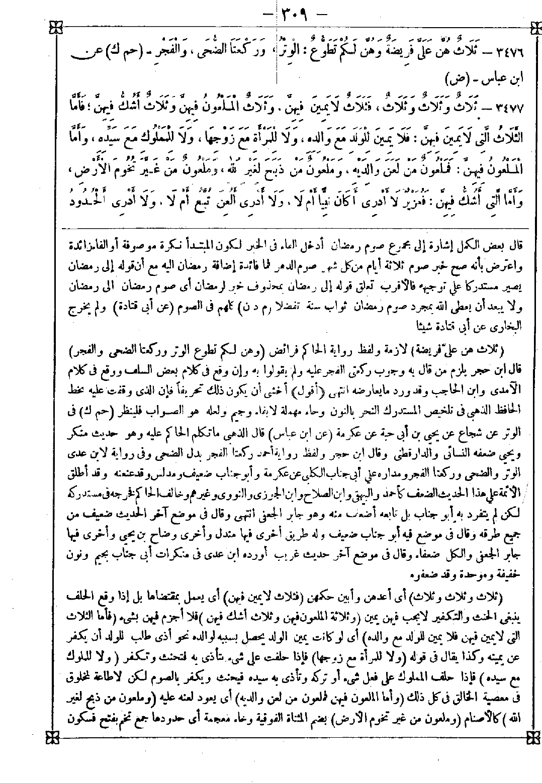 3476 - (ثلاث هن علي فريضة) لازمة ولفظ رواية الحاكم فرائض (وهن لكم تطوع الوتر وركعتا الضحى والفجر) قال ابن حجر: يلزم من قال به وجوب ركعتي الفجر عليه ولم يقولوا به وإن وقع في كلام بعض السلف ووقع في كلام الآمدي وابن الحاجب وقد ورد ما يعارضه انتهى (أقول) أخشى أن يكون ذلك تحريفا فإن الذي وقفت عليه بخط الحافظ الذهبي في تلخيص المستدرك النحر بالنون وحاء مهملة لا بفاء وجيم ولعله هو الصواب فلينظر