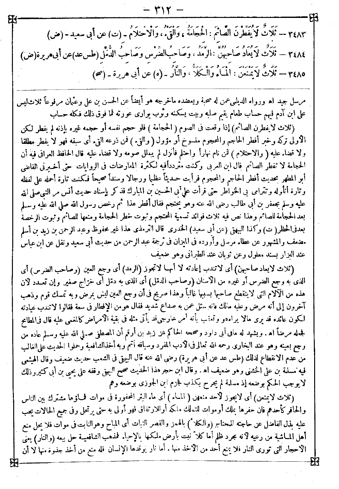 3483 - (ثلاث لا يفطرن الصائم) إذا وقعت في الصوم (الحجامة) فلو حجم نفسه أو حجمه غيره بإذنه لم يفطر لكن الأولى تركه وخبر أفطر الحاجم والمحجوم منسوخ أو مؤول (والقيء) فمن ذرعه القيء أي سبقه فهو لا يفطر مطلقا ولا قضاء عليه (والاحتلام) فمن نام نهارا واحتلم فأنزل لم يبطل صومه ولا قضاء عليه قال الحافظ العراقي: فيه أن الحجامة لا تفطر الصائم قال ابن العربي: وكنت مترددا فيه لكثرة المعارضات في الروايات حتى أخبرني القاضي أبو المطهر بحديث أفطر الحاجم والمحجوم فرأيت حديثا عظيما ورجالا وسندا صحيحا فكنت تارة أحمله على لفظه وتارة أتأوله وتترامى بي الخواطر حتى قرأت على أبي الحسين بن المبارك فذكر بإسناد حديث أنس مر النبي صلى الله عليه وسلم بجعفر بن أبي طالب رضي الله عنه وهو يحتجم فقال: أفطر هذا ثم رخص رسول الله صلى الله عليه وسلم بعد الحجامة للصائم وهذا نص فيه ثلاث فوائد تسمية المحتجم وثبوت خطر الحجامة ومنعها للصائم وثبوت الرخصة بعد في الحظر