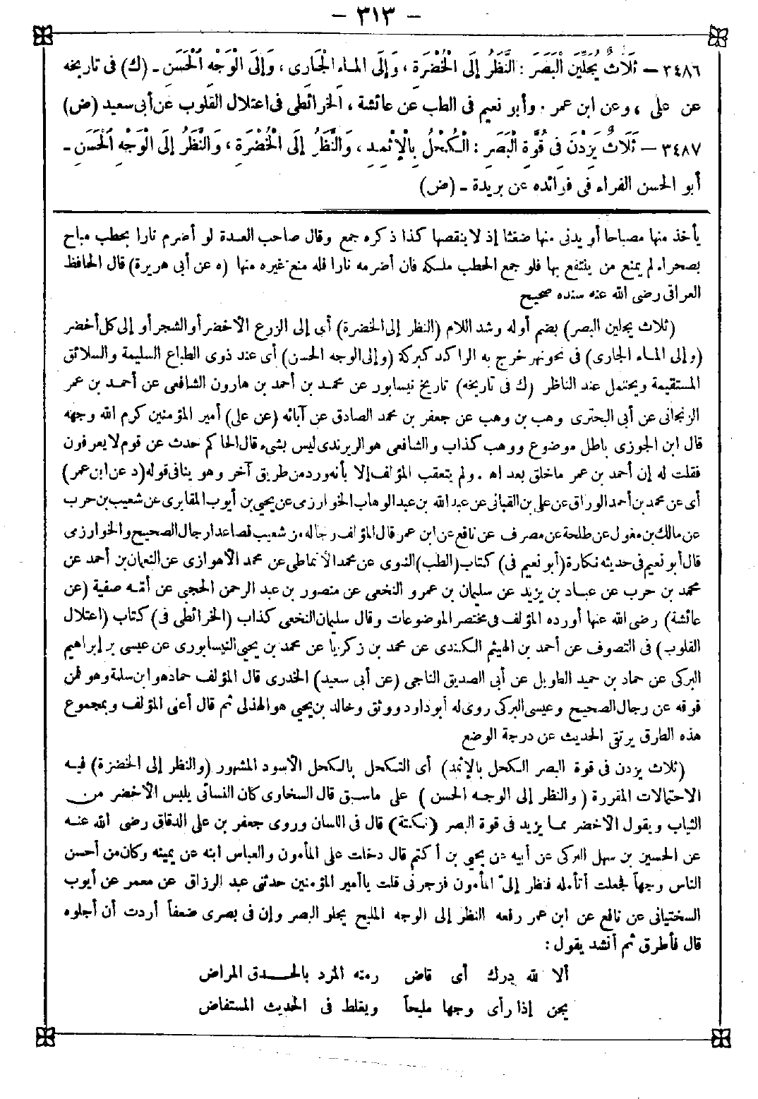 3487 - (ثلاث يزدن في قوة البصر الكحل بالإثمد) أي التكحل بالكحل الأسود المشهور (والنظر إلى الخضرة) فيه الإحتمالات المقررة (والنظر إلى الوجه الحسن) على ما سبق قال السخاوي: كان النسائي يلبس الأخضر من الثياب ويقول الأخضر مما يزيد في قوة البصر (نكتة) قال في اللسان وروى جعفر بن علي الدقاق رضي الله عنه عن الحسين بن سهل التركي عن أبيه عن يحيى بن أكثم قال: دخلت على المأمون والعباس ابنه عن يمينه وكان من أحسن الناس وجها فجعلت أتأمله فنظر إلي المأمون فزجرني قلت: يا أمير المؤمنين حدثني عبد الرزاق عن معمر عن أيوب السختياني عن نافع عن ابن عمر رفعه النظر إلى الوجه المليح يجلو البصر وإن في بصري ضعفا أردت أن أجلوه قال فأطرق ثم أنشد يقول: