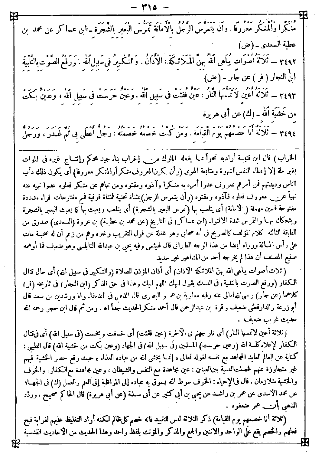 3493 - (ثلاثة أعين لا تمسها النار) أي نار جهنم في الآخرة (عين فقئت) أي خسفت وبخست (في سبيل الله) أي في قتال الكفار لإعلاء كلمة الله (وعين حرست) المسلمين (في سبيل الله) في الجهاد (وعين بكت من خشية الله) قال الطيبي: كناية عن العالم العابد المجاهد مع نفسه لقوله تعالى: {إنما يخشى الله من عباده العلماء} حيث وقع حصر الخشية فيهم غير متجاوزة عنهم فحصلت النسبة بين العينين: عين مجاهدة مع النفس والشيطان وعين مجاهدة مع الكفار والخوف والخشية متلازمان. قال في الإحياء: الخوف سوط الله يسوق به عباده إلى المواظبة إلى العلم والعمل