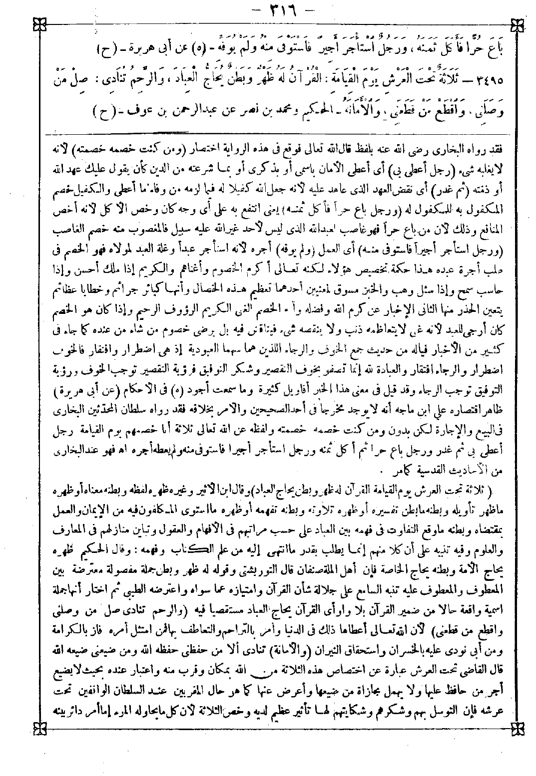 3495 - (ثلاث تحت العرش يوم القيامة القرآن له ظهر وبطن يحاج العباد) وقال ابن الأثير وغيره: ظهره لفظه وبطنه معناه أو ظهره ما ظهر تأويله وبطنه ما بطن تفسيره أو ظهره تلاوته وبطنه تفهمه أو ظهره ما استوى المكلفون فيه من الإيمان والعمل بمقتضاه وبطنه ما وقع التفاوت في فهمه بين العباد على حسب مراتبهم في الأفهام والعقول وتباين منازلهم في المعارف والعلوم وفيه تنبيه على أن كلا منهم إنما يطلب بقدر ما انتهى إليه من علم الكتاب وفهمه وقال الحكيم: ظهره يحاج الأمة وبطنه يحاج الخاصة فإن أهل الملة صنفان قال التوربشتي: وقوله له ظهر وبطن جملة مفصولة معترضة بين المعطوف والمعطوف عليه تنبه السامع على جلالة شأن القرآن وامتيازه عما سواه واعترضه الطيبي ثم اختار أنها جملة اسمية واقعة حالا من ضمير القرآن بلا واو أي القرآن يحاج العباد مستقصيا فيه (والرحم تنادي صل من وصلني واقطع من قطعني) لأن الله تعالى أعطاها ذلك في الدنيا وأمر بالتراحم والتعاطف بها فمن امتثل أمره فاز بالكرامة ومن أبى نودي عليه بالخسران واستحقاق النيران (والأمانة) تنادي ألا من حفظني حفظه الله ومن ضيعني ضيعه الله قال القاضي: تحت العرش عبارة عن اختصاص هذه الثلاثة من الله بمكان وقرب منه واعتبار عنده بحيث لا يضيع أجر من حافظ عليها ولا يهمل مجازاة من ضيعها وأعرض عنها كما هو حال المقربين عند السلطان الواقفين تحت عرشه فإن التوسل بهم وشكرهم وشكايتهم لها تأثير عظيم لديه وخص الثلاثة لأن كل ما يحاوله المرء إما أمر دائر بينه -[317]- وبين ربه خاصة أو بينه وبين الخلق عامة أو بينه وبين أقاربه وأهل بيته والقرآن وصلة بين العبد وربه فمن راعى أحكامه واتبع ظواهره وبواطنه أدى حق الربوبية وأتى بوظيفة العبودية والأمانة تعم عموم الناس فإن دمائهم وأموالهم وأعراضهم أمانات بينهم فمن قام بحقها أقام العدل وجانب الظلم ومن وصل الرحم وراقب الأقارب ودفع عنهم المخاوف وأحسن إليهم أدى حقه وخرج من عهدته ولما كان القرآن أعظم قدرا وأرفع منارا والقيام به يشمل الأمرين الآخرين قدم ذكره وأخبر عنه بأنه يحاج العباد أي يخاصمهم فيما أعرضوا عن أحكامه ولم يلتفتوا لمواعظه وأمثاله سواء ما ظهر معناه فأغنى عن التأويل أو خفي واحتاج إليه وأخر الأمانة لأنها أخصها وأفردها بالذكر وإن اشتملت محافظته على الأولين على محافظتها لأنها أحق حقوق الخلق أن تحفظ ولأنه أراد أن يبين أن صلة الرحم وقطيعته بهذه المثابة العظيمة من الوعد والوعيد اه. وقال الأشرف: الضمير في تنادي عائد إلى الرحم ويمكن عوده إلى كل من الأمانة والرحم