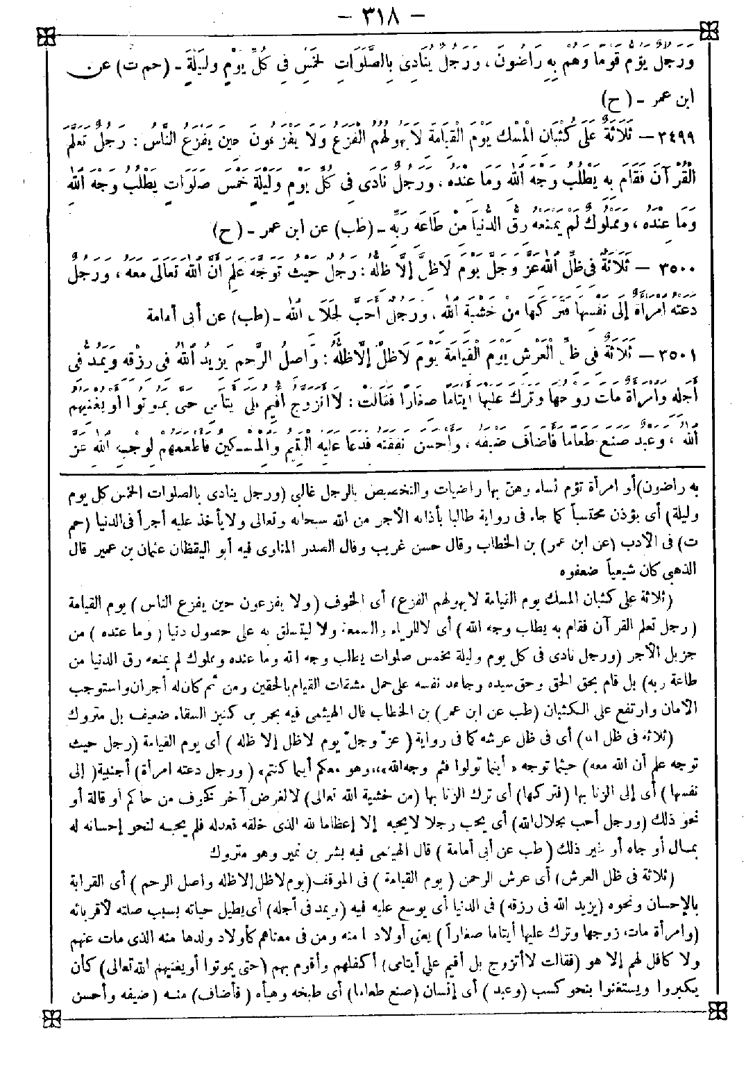 3501 - (ثلاثة في ظل العرش) أي عرش الرحمن (يوم القيامة) في الموقف (يوم لا ظل إلا ظله واصل الرحم) أي القرابة بالإحسان ونحوه (يزيد الله في رزقه) في الدنيا أي يوسع عليه فيه (ويمد في أجله) أي يطيل حياته بسبب صلته لأقربائه (وامرأة مات زوجها وترك عليها أيتاما صغارا) يعني أولادا منه ومن في معناهم كأولاد ولدها منه الذي مات عنهم ولا كافل لهم إلا هو (فقالت لا أتزوج بل أقيم على أيتامي) أكفلهم وأقوم بهم (حتى يموتوا أو يغنيهم الله تعالى) كأن يكبروا ويستغنوا بنحو كسب (وعبد) أي إنسان (صنع طعاما) أي طبخه وهيأه (فأضاف) منه (ضيفه وأحسن -[319]- نفقته) أي أحسن القيام بها (فدعا عليه) أي طلب له (اليتيم والمسكين) المراد به هنا ما يشمل الفقير لأنهما إذا اجتمعا افترقا وإذا افترقا اجتمعا (فأطعمهم لوجه الله) عز وجل عن كل نقص ووصف ليس في الكمال المطلق أقصاه وغايته أي فعل ذلك لوجه الله لا لغرض آخر كرياء أو سمعة أو توصل إلى شيء من المقاصد الدنيوية كبعض من يجمع الأيتام والزمناء والعميان عنده في نحو زاوية ويتشيطن على ولاة الأمور ويدخل عليهم بأنه ليس يريد الدنيا وإنما يريد مرتبا للقيام بأدواء هؤلاء حتى إذا تحصل على حظه من ذلك كتبه باسم نفسه واستخدم أهل الزاوية كالعبيد كما فعل الناس الآن ممن يزعم الصلاح