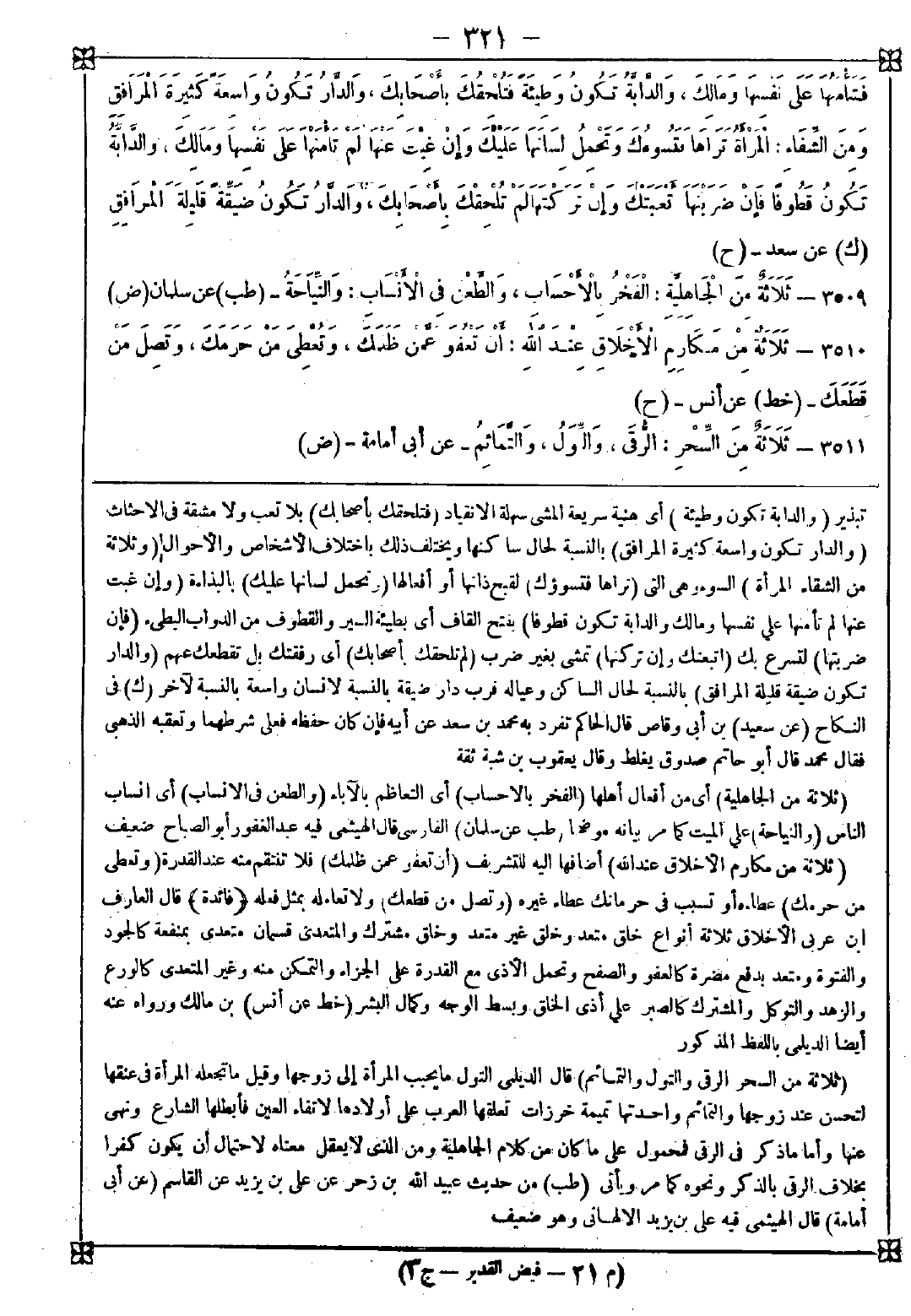 3510 - (ثلاثة من مكارم الأخلاق عند الله) أضافها إليه للتشريف (أن تعفو عمن ظلمك) فلا تنتقم منه عند القدرة (وتعطي من حرمك) عطاءه أو تسبب في حرمانك عطاء غيره (وتصل من قطعك) ولا تعامله بمثل فعله. <فائدة> قال العارف ابن عربي: الأخلاق ثلاثة أنواع خلق متعد وخلق غير متعد وخلق مشترك والمتعدي قسمان متعدي بمنفعة كالجود والفتوة ومتعد بدفع مضرة كالعفو والصفح وتحمل الأذى مع القدرة على الجزاء والتمكن منه وغير المتعدي كالورع والزهد والتوكل والمشترك كالصبر على أذى الخلق وبسط الوجه وكمال البشر