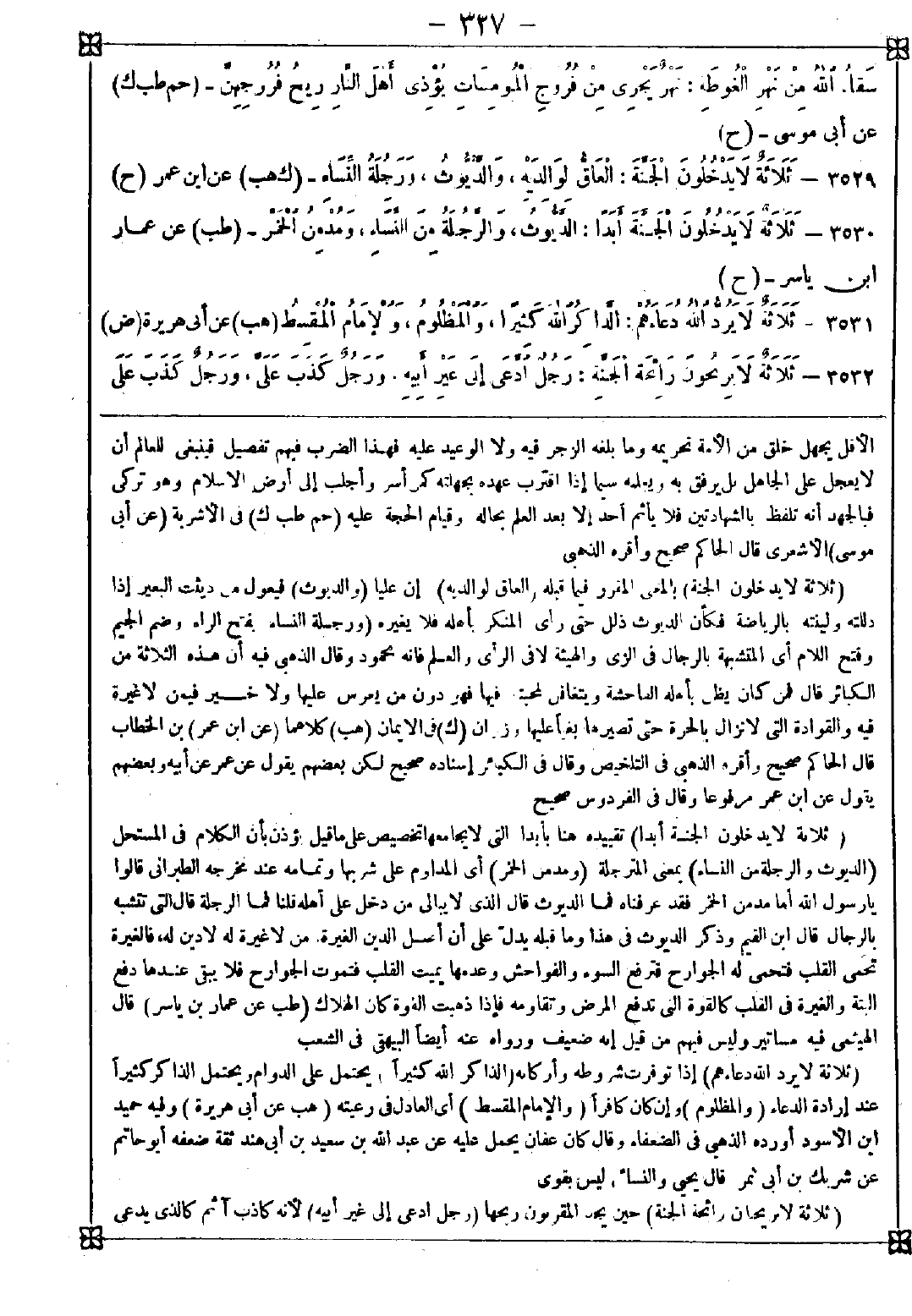 3530 - (ثلاثة لا يدخلون الجنة أبدا) تقييده هنا بأبدا التي لا يجامعها تخصيص على ما قيل يؤذن بأن الكلام في المستحل (الديوث والرجلة من النساء) بمعنى المترجلة (ومدمن الخمر) أي المداوم على شربها وتمامه عند مخرجه الطبراني قالوا: يا رسول الله أما مدمن الخمر فقد عرفناه فما الديوث قال: الذي لا يبالي من دخل على أهله قلنا: فما الرجلة قال: التي تتشبه بالرجال قال ابن القيم: وذكر الديوث في هذا وما قبله يدل على أن أصل الدين الغيرة ومن لا غيرة له لا دين له فالغيرة تحمي القب فتحمي له الجوارح فترفع السوء والفواحش وعدمها يميت القلب فتموت الجوارح فلا يبقى عندها دفع البتة والغيرة في القلب كالقوة التي تدفع المرض وتقاومه فإذا ذهبت القوة كان الهلاك