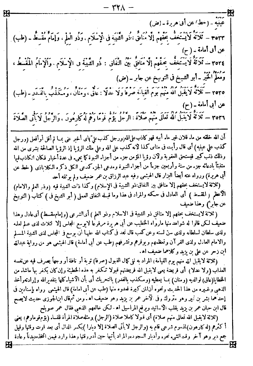 3535 - (ثلاثة لا يقبل الله منهم يوم القيامة) المراد به نفي كمال القبول (صرفا) توبة أو نافلة أو وجها يصرف فيه عن نفسه العذاب (ولا عدلا) أي فريضة يعني لا يقبل الله فريضتهم قبولا تكفر به هذه الخطيئة وإن كان يكفر بها ما شاء من الخطايا (عاق) لوالديه (ومنان) بما يعطيه (ومكذب بالقدر) بالتحريك أي بأن الأشياء كلها بتقدير الله وإرادته وأخذ الذهبي وغيره من هذا الحديث ونحوه أن المن كبيرة فعدوه منها