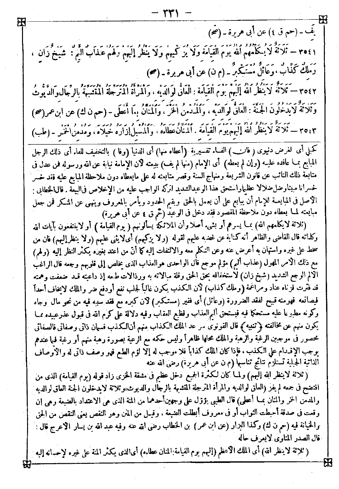3541 - (ثلاثة لا يكلمهم الله) بما يسرهم أو بشيء أصلا وأن الملائكة يسألونهم (يوم القيامة) أو لا ينتفعون بآيات الله وكلماته قال القاضي: والظاهر أنه كناية عن غضبه عليهم لقوله (ولا يزكيهم) أي لا يثني عليهم (ولا ينظر إليهم) فإن من سخط على غيره واستهان به أعرض عنه وعن التكلم معه والالتفات إليه كما أن من اعتد بغيره يكثر النظر إليه (ولهم) مع ذلك الأمر المهول (عذاب أليم) مؤلم موجع قال الواحدي: هو العذاب الذي يخلص إلى قلوبهم وجعه قال الراغب: الألم الوجع الشديد (شيخ زان) لاستخفافه بحق الحق وقلة مبالاته به ورذالات طبعه إذ داعيته قد ضعفت وهمته قد فترت فزناه عناد ومراغمة (وملك كذاب) لأن الكذب يكون غالبا لجلب نفع أو دفع ضر والملك لا يخاف أحدا فيصانعه فهو منه قبيح لفقد الضرورة (وعائل) أي فقير (مستكبر) لأن كبره مع فقد سببه فيه من نحو مال وجاه وكونه مطبوعا عليه مستحكما فيه فيستحق أليم العذاب وفظيع العقاب وفيه دلالة على كرم الله في قبول عذر عبيده مما يكون منهم عن مخالفته <تنبيه> قال القونوي: سر عد الملك الكذاب منهم أن الكذب قسمان ذاتي وصفاتي فالصفاتي محصور في موجبين الرغبة والرهبة والملك محلها ظاهرا وليس حكمه مع الرعية بصورة رهبة منهم أو رغبة فيما عندهم يوجب الإقدام على الكذب فإذا كان الملك كذابا فلا موجب له إلا لؤم الطبع فهو وصف ذاتي له والأوصاف الذاتية الجبلية تستلزم نتائج تناسبها