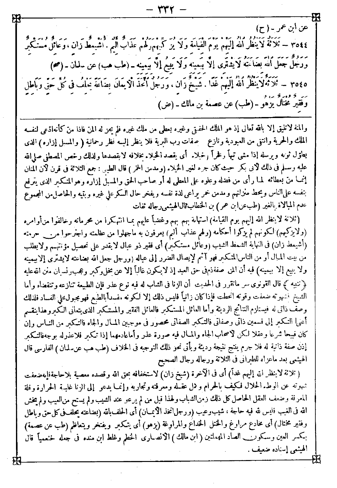 3544 - (ثلاثة لا ينظر الله إليهم يوم القيامة) استهانة بهم وغضبا عليهم بما انتهكوا من محرماته وخالفوا من أوامره (ولا يزكيهم) لكونهم لم يزكوا أحكامه (ولهم عذاب أليم) يعرفون به ما جهلوا من عظمته واجترحوا من حرمته (أشيمط زان) في النهاية الشمط الشيب (وعائل مستكبر) أي فقير ذو عيال لا يقدر على تحصيل مؤونتهم ولا يطلب من بيت المال أو من الناس المتكبر فهو آثم لإيصال الضرر إلى عياله (ورجل جعل الله بضاعته لا يشتري إلا بيمينه ولا يبيع إلا بيمينه) فيه أن المن صفة ذم في حق العبد إذ لا يكون غالبا إلا عن بخل وكبر وعجب ونسيان منن الله عليه <تنبيه> قال القونوي: سر ما تقرر في الحديث أن الزنا في الشباب له فيه نوع عذر فإن الطبيعة تنازعه وتتقضاه وأما الشيخ فشهوته ضعفت وقوته انحطت فإذا كان زانيا فليس ذلك إلا لكونه مفسدا بالطبع فهو مجبول على الفساد فلذلك وصف ذاتي له فيستلزم النتائج الرديئة وأما العائل المستكبر فالعائل الفقير والمستكبر الذي يتعانى الكبر وهذا ينقسم أعني التكبر إلى قسمين ذاتي وصفاتي فالتكبر الصفاتي محصور في موجبين المال والجاه فالتكبر من الناس وإن كان قبيحا شرعا وعقلا لكن لأصحاب الجاه والمال فيه صورة عذر وأما عادمهما إذا تكبر فلا عذر له بوجه فالتكبر إذن صفة ذاتية له فلا جرم ينتج نتيجة رديئة ويأتي نحو ذلك التوجيه في الخلاف