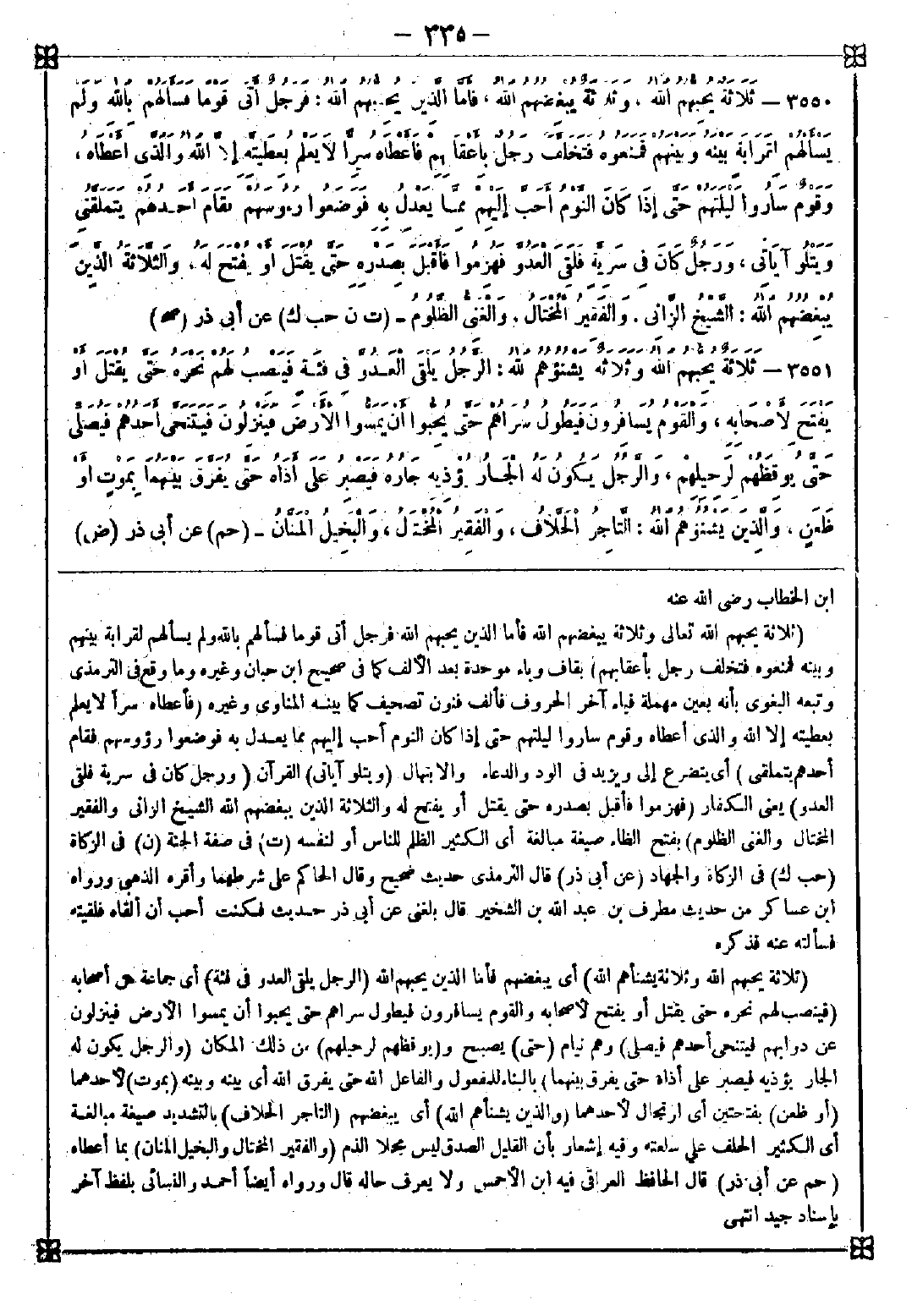 3550 - (ثلاثة يحبهم الله تعالى وثلاثة يبغضهم الله فأما الذين يحبهم الله فرجل أتى قوما فسألهم بالله ولم يسألهم لقرابة بينهم وبينه فمنعوه فتخلف رجل بأعقابهم) بقاف وباء موحدة بعد الألف كما في صحيح ابن حبان وغيره وما وقع في الترمذي وتبعه البغوي بأنه بعين مهملة فياء آخر الحروف فألف فنون تصحيف كما بينه المناوي وغيره (فأعطاه سرا لا يعلم بعطيته إلا الله والذي أعطاه وقوم ساروا ليلتهم حتى إذا كان النوم أحب إليهم مما يعدل به فوضعوا رؤوسهم فقام أحدهم يتملقني) أي يتضرع إلي ويزيد في الود والدعاء والإبتهال (ويتلو آياتي) القرآن (ورجل كان في سرية فلقي العدو) يعني الكفار (فهزموا فأقبل بصدره حتى يقتل أو يفتح له والثلاثة الذين يبغضهم الله الشيخ الزاني والفقير المختال والغني الظلوم) بفتح الظاء صيغة مبالغة أي الكثير الظلم للناس أو لنفسه