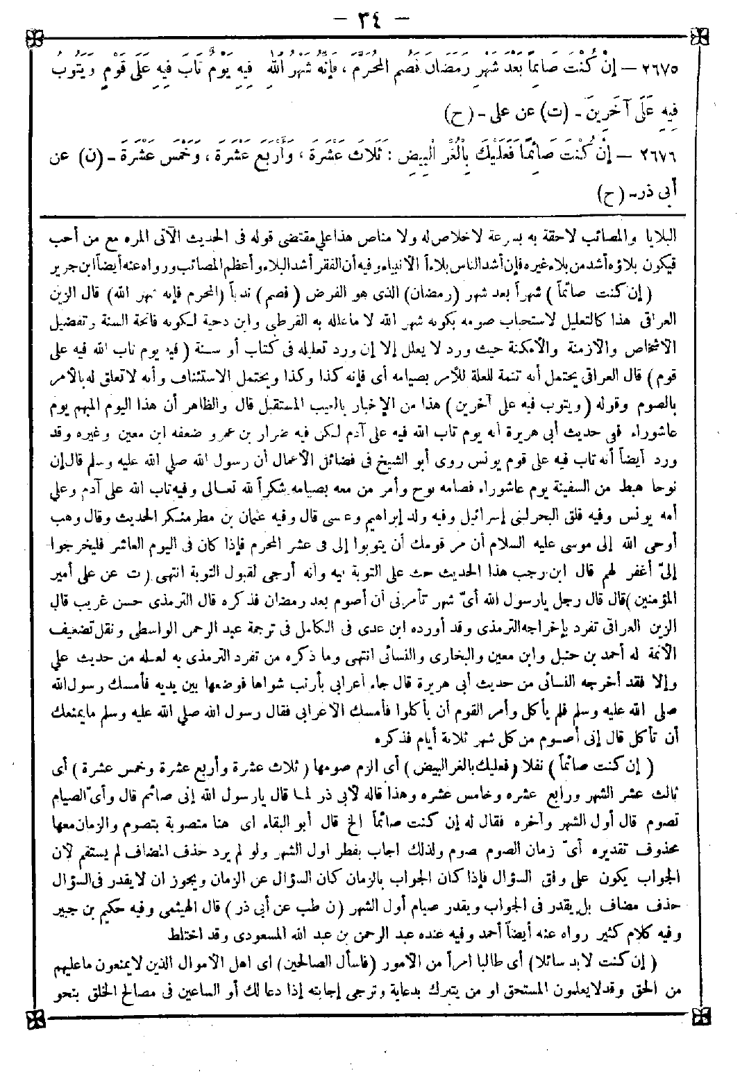 (ت عن علي أمير المؤمنين) قال: قال رجل: يا رسول الله أي شهر تأمرني أن أصوم بعد رمضان فذكره قال الترمذي: حسن غريب قال الزين العراقي: تفرد بإخراجه الترمذي وقد أورده ابن عدي في الكامل في ترجمة عبد الله الواسطي ونقل تضعيف الأئمة له أحمد ابن حنبل وابن معين والبخاري والنسائي انتهى وما ذكره من تفرد الترمذي به لعله من حديث علي وإلا فقد أخرجه النسائي من حديث أبي هريرة قال: جاء أعرابي بأرنب شواها فوضعها بين يديه فأمسك رسول الله صلى الله عليه وسلم فلم يأكل وأمر القوم أن يأكلوا فأمسك الأعرابي فقال رسول الله صلى الله عليه وسلم: ما يمنعك أن تأكل قال: إني أصوم من كل شهر ثلاثة أيام فذكره