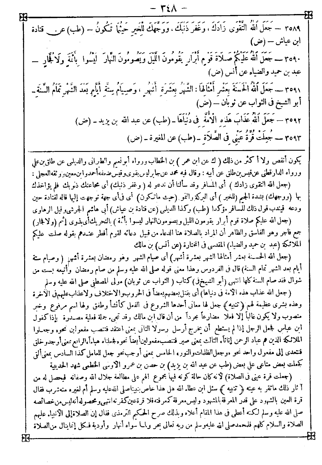 3592 - (جعل الله عذاب هذه الأمة في دنياها) أي بقتل بعضهم بعضا في الحروب والاختلاف ولا عذاب عليهم في الاخرة وهذه بشرى عظيمة لهم (1) <تنبيه> جعل لها معاني: أحدها: الشروع في الفعل كأنشأ وطفق ولها اسم مرفوع وخبر منصوب ولا يكون غالبا إلا فعلا مضارعا مجردا من أن. قال ابن مالك: وقد تجيء جملة فعلية مصدرة بإذا كقول ابن عباس: فجعل الرجل إذا لم يستطع أن يخرج أرسل رسولا. الثاني: بمعنى اعتقد فتنصب مفعولين نحو {وجعلوا الملائكة الذين هم عباد الرحمن إناثا} . الثالث: بمعنى صبر فتنصب مفعولين أيضا نحو {فجعلناه هباءا} . الرابع: بمعنى أوجد وخلق فتتعدى إلى مفعول واحد نحو {وجعل الظلمات والنور} . الخامس: بمعنى أوجب نحو جعل للعامل كذا. السادس: بمعنى ألقى كجعلت بعض متاعي على بعض