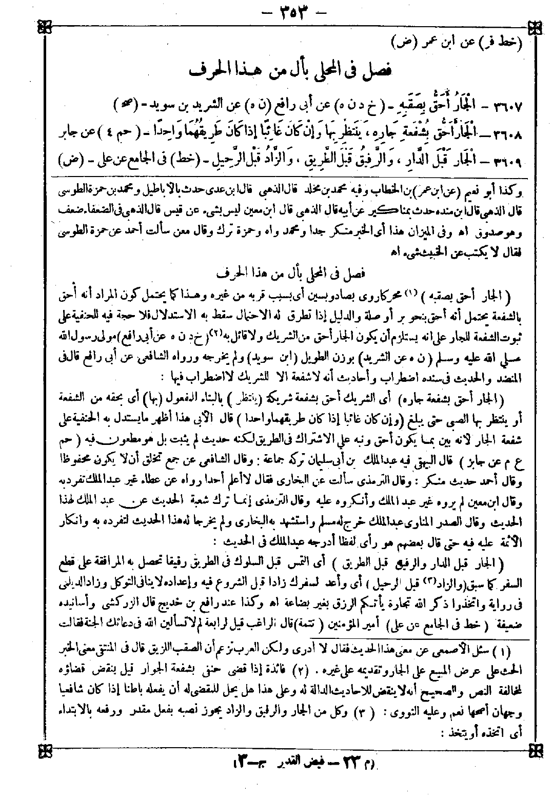 3608 - (الجار أحق بشفعة جاره) أي الشريك أحق بشفعة شريكه (ينتظر) بالبناء للمفعول (بها) أي بحقه من الشفعة أو ينتظر بها الصبي حتى يبلغ (وإن كان غائبا إذا كان طريقهما واحدا) قال الأبي: هذا أظهر ما يستدل به الحنفية على شفعة الجار لأنه بين بما يكون أحق ونبه على الاشتراك في الطريق لكنه حديث لم يثبت بل هو مطعون به