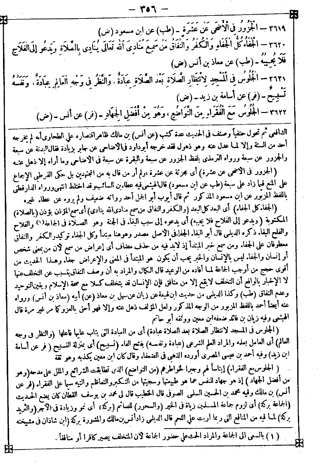 3621 - (الجلوس في المسجد لانتظار الصلاة بعد الصلاة عبادة) أي من العبادة التي يثاب عليها فاعلها (والنظر في وجه العالم) أي العامل بعلمه والمراد العلم الشرعي (عبادة ونفسه) بفتح الفاء (تسبيح) أي بمنزلة التسبيح