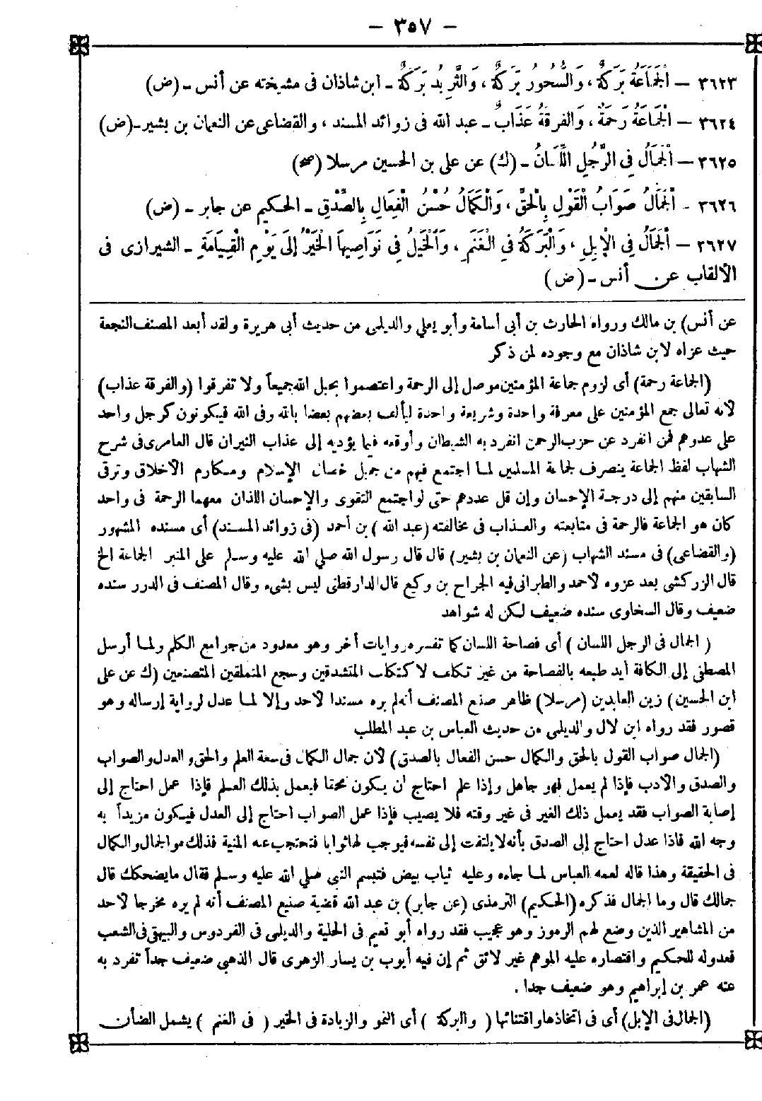 3626 - (الجمال صواب القول بالحق والكمال حسن الفعال بالصدق) لأن جمال الكمال في سعة العلم والحق والعدل والصواب والصدق والأدب فإذا لم يعمل فهو جاهل وإذا علم احتاج أن يكون محقا فيعمل بذلك العلم فإذا عمل احتاج إلى إصابة الصواب فقد يعمل ذلك الغير في غير وقته فلا يصيب فإذا عمل الصواب احتاج إلى العدل فيكون مزيدا به وجه الله فإذا عدل احتاج إلى الصدق بأنه لا يلتفت إلى نفسه فيوجب لها ثوابا فتحتجب عنه المنية فذلك هو الجمال والكمال في الحقيقة وهذا قاله لعمه العباس لما جاءه وعليه ثياب بيض فتبسم النبي صلى الله عليه وسلم فقال: ما يضحكك قال: جمالك قال: وما الجمال فذكره