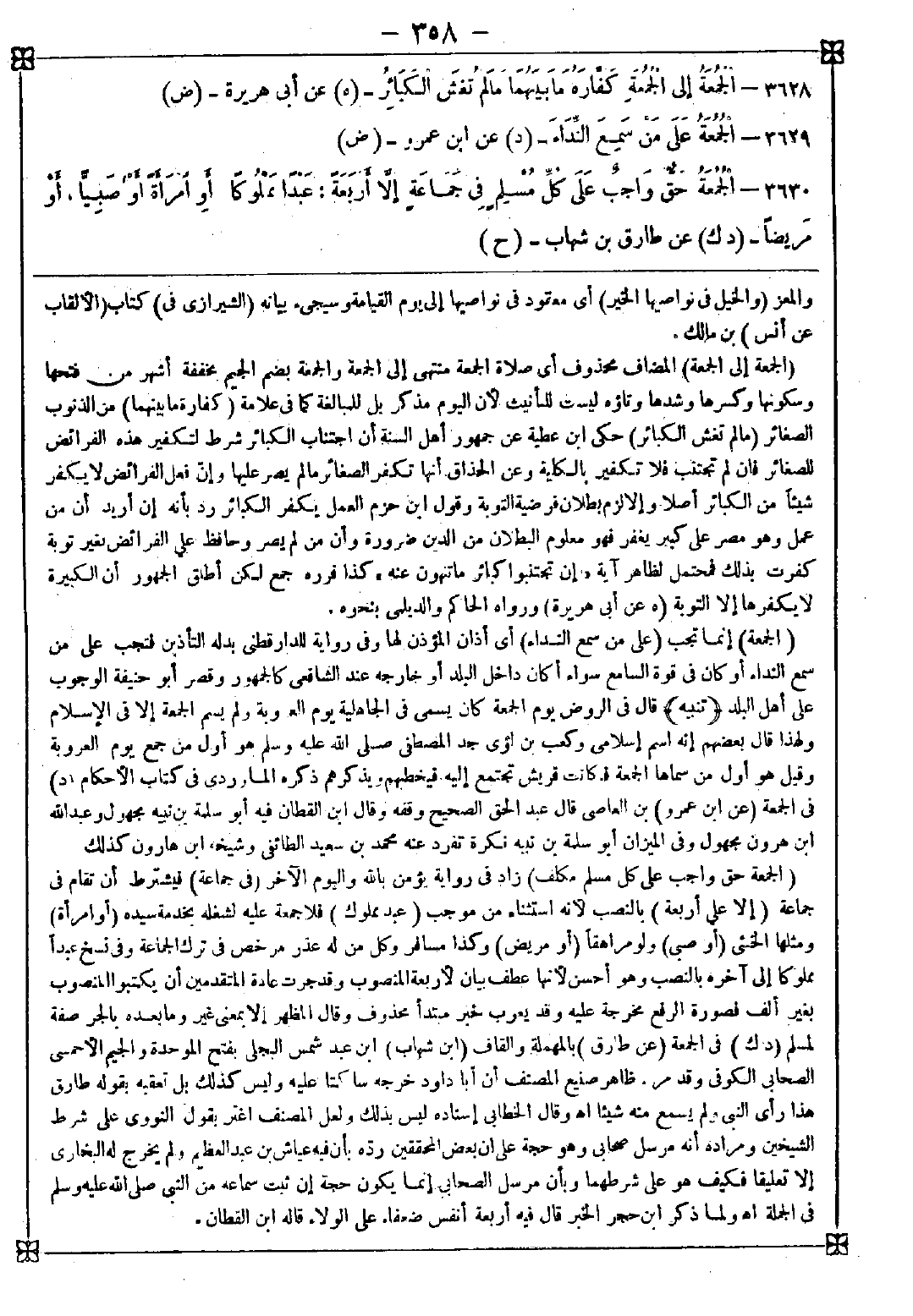 3630 - (الجمعة حق واجب على كل مسلم مكلف) زاد في رواية يؤمن بالله واليوم الآخر (في جماعة) فيشترط أن تقام في جماعة (إلا على أربعة) بالنصب لأنه استثناء من موجب (عبد مملوك) فلا جمعة عليه لشغله بخدمة سيده (أو امرأة) ومثلها الخنثى (أو صبي) ولو مراهقا (أو مريض) وكذا مسافر وكل من له عذر مرخص في ترك الجماعة وفي نسخ عبدا مملوكا إلى آخره بالنصب وهو أحسن لأنها عطف بيان لأربعة المنصوب وقد جرت عادة المتقدمين أن يكتبوا المنصوب بغير ألف فصورة الرفع مخرجة عليه وقد يعرب خبر مبتدأ محذوف وقال المظهر: إلا بمعنى غير وما بعده بالجر صفة لمسلم