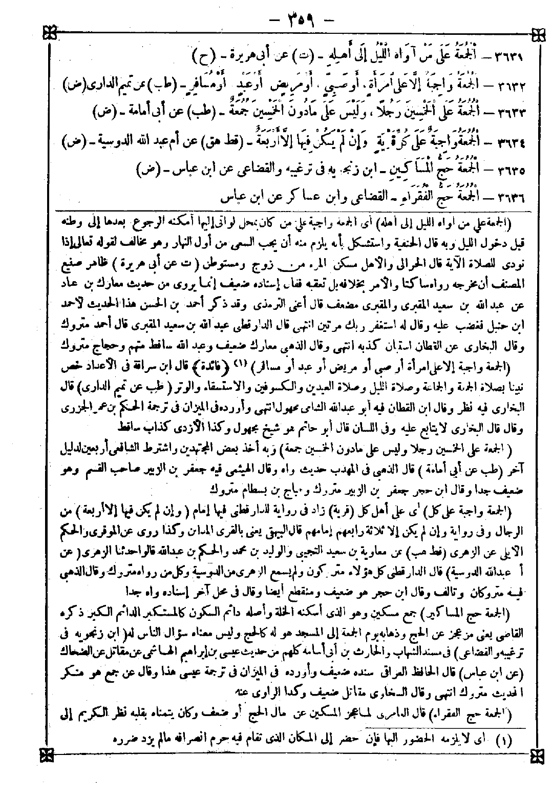3633 - (الجمعة على الخمسين رجلا وليس على ما دون الخمسين جمعة) وبه أخذ بعض المجتهدين واشترط الشافعي أربعين لدليل آخر
