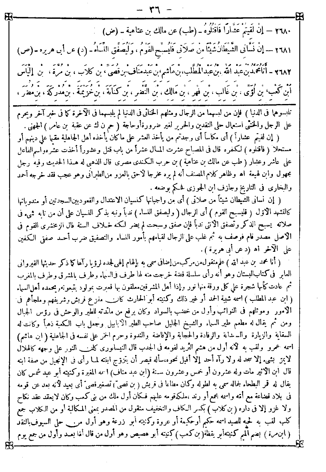 2682 - (أنا محمد بن عبد الله) علم منقول من مركب من إضافي سمي به بإلهام إلهي لجده لرؤيا رآها كما ذكر حديثها القيرواني العابر في كتاب البستان وهو أنه رأى سلسلة فضة خرجت منه لها طرف في السماء وطرف بالمشرق وطرف بالمغرب ثم عادت كأنها شجرة على كل ورقة منها نور وإذا أهل المشرقين معلقون بها فعبرت بمولود يتبعونه ويحمده أهل السماء (ابن عبد المطلب) اسمه شيبة الحمد أو غير ذلك وكنيته أبو الحارث كان مفزع قريش وشريفهم وملجأهم في الأمور وموئلهم في النوائب وأول من خضب بالسواد وكان يرفع من مائدته للطير والوحش في رؤوس الجبال ومن ثم يقال له مطعم طير السماء والشيخ الجليل صاحب الطير الأبابيل وجعل باب الكعبة ذهبا وكانت له السقاية والزيارة والسدانة والرفادة والحجابة والإفاضة والندوة وحرم الخمر على نفسه في الجاهلية (ابن هاشم) اسمه عمرو ولقب به لأنه أول من هشم الثريد لقومه في الجدب قال النيسابوري: كان النور على وجهه كالهلال لا يمر بشيء إلا سجد له ولا رآه أحد إلا أقبل نحوه سأله قيصر أن يتزوج ابنته لما رأى في الإنجيل من صفة ابنه قال ابن الأثير: مات وله عشرون أو خمس وعشرون سنة (ابن عبد مناف) اسمه المغيرة وكنيته أبو عبد شمس كان يقال له قمر البطحاء لجماله سمي به لطوله وكان مطاعا في قريش (بن قصي) تصغير قصي أي بعيد لأنه بعد عن قومه في بلاد قضاعة مع أمه واسمه مجمع أو رند ملكه قومه عليهم فكان أول ملك من بني كعب وكان لا يعقد عقد نكاح ولا غزو إلا في داره (بن كلاب) بكسر الكاف والتخفيف منقول من المصدر بمعنى المكالبة أو من الكلاب جمع كلب لقب به لحبه للصيد اسمه حكيم أو حكيمة أو عروة وكنيته أبو زرعة وهو أول من حلى السيوف بالنقد (ابن مرة) بضم الميم كنيته أبو يقظة (بن كعب) كنيته أبو هصيص وهو أول من قال أما بعد وأول من جمع يوم -[37]- العروبة وكان يجمع قريشا يومها فيخطبهم ويذكرهم بمبعث النبي صلى الله عليه وسلم وأنه من ولده (ابن لؤي) بضم اللام وهمزة وتسهل (ابن غالب) كنيته أبو تيم (ابن فهر) بكسر فسكون اسمه قريش وإليه ينسب قريش فما كان فوقه فكناني (بن مالك) اسم فاعل من ملك يملك يكنى أبا الحارث (ابن النضر) بفتح فسكون اسمه قيس لقب به لنضارة وجهه وجماله ويكنى أبا مخلد أو عبد المطلب رأى في منامه شجرة خضراء خرجت من ظهره ولها أغصان نور من نور فجذبت إلى السماء فأولت بالعز والسؤدد (بن كنانة) لقب به لأنه كان سترا على قومه كالكنانة أو الجعبة الساترة للسهام لأنه كان عظيم القدر يحج إليه العرب لعلمه وفضله (بن خزيمة) تصغير خزمة يكنى أبا أسد له مكارم وأفضال بعدد الرمال (بن مدركة) بضم فسكون اسمه عمرو وحكى الرشاطي عليه الإجماع وكنيته أبو هذيل لقب به لأنه أدرك أرنبا عجز عنها رفقاؤه (بن إلياس) بكسر الهمزة أو بفتحها ولامه للتعريف وهمزته للوصل عند الأكثر كنيته أبو عمرو وهو أول من أهدى البدن للبيت قيل وكان يسمع في صلبه تلبية النبي صلى الله عليه وسلم بالحج ولما مات أسفت زوجته خندف عليه فنذرت لا تقيم ببلد مات فيه ولا يظلها سقف وحرمت الرجال والطيب وخرجت سائحة حتى ماتت فضرب بها المثل (بن مضر) بضم ففتح معدول عن ماضر اسمه عمرو ومن كلامه من يزرع شرا يحصده وخير الخير أعجله واحملوا أنفسكم على مكروهها فيما يصلحها واصرفوها عن هواها فيما يفسدها وكانت له فراسة وقيافة (ابن نزار) بكسر النون والتخفيف من النذر القليل لأن أباه حين ولد نظر إلى نور النبوة بين عينيه ففرح به وأطعمه كثيرا وقال: هذا نور في حق هذا وكنيته أبو إياد بن مسعد بن عدنان إلى هنا معلوم الصحة متفق عليه. قال ابن دحية: أجمعوا على أنه لا يجاوز عدنان وعن الحبر بين عدنان وإسماعيل ثلاثون أبا لا يعرفون ومن ثم أنكر مالك على من رفع نسبه إلى آدم عليه السلام وقال: من أخبره به أي لأنه من كلام المؤرخين ولا ثقة بهم قال ابن القيم: ولا خلاف أن عدنان من ولد إسماعيل وهو الذبيح على الصواب. قال: والقول بأنه إسحاق باطل من عشرين وجها. وقال ابن تيمية: هو إنما يتلقى من أهل الكتاب وهو باطل بنص كتابهم (وما افترق الناس فرقتين إلا جعلني الله في خي