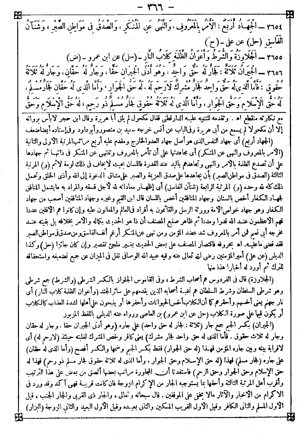 3656 - (الجيران) بكسر الجيم جمع جار (ثلاثة: فجار له حق واحد) على جاره (وهو أدنى الجيران حقا وجار له حقان وجار له ثلاث حقوق فأما الذي له حق واحد فجار مشرك) يعني كافر وخص المشرك لغلبته حينئذ (لا رحم له) أي لا قرابة بينه وبين جاره المؤمن فهذا (له حق الجوار) فقط بكسر الجيم وضمها والكسر أفصح (وأما الذي له حقان) على جاره (فجار مسلم) فهذا (له حق الإسلام وحق الجوار وأما الذي له ثلاث حقوق فجار مسلم ذو رحم) فهذا له (حق الإسلام وحق الجوار وحق الرحم) فاستفدنا أن المجاورة مراتب بعضها ألصق من بعض على هذا الترتيب وأقرب أهل المرتبة الثالثة وأحقها بما يستوجبه الجار من الإكرام الزوجة فإن كانت قريبة فهي آكد وقد ورد في الإكرام من الأخبار والآثار ما لا يخفى على الموفقين. قال سبحانه وتعالى {والجار ذي القربى والجار الجنب} قيل الأول المسلم والثاني الكافر وقيل الأول القريب المسكين والثاني بعيده وقيل الأول البعيد والثاني الزوجة