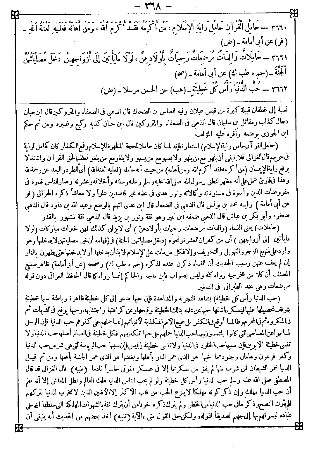 3662 - (حب الدنيا رأس كل خطيئة) بشاهد التجربة والمشاهدة فإن حبها يدعو إلى كل خطيئة ظاهرة وباطنة سيما خطيئة يتوقف تحصيلها عليها فيسكر عاشقها حبها عن علمه بتلك الخطيئة وقبحها وعن كراهتها واجتنابها وحبها يوقع في الشبهات ثم في المكروه ثم في المحرم وطالما أوقع في الكفر بل جميع الأمم المكذبة لأنبيائهم إنما حملهم على كفرهم حب الدنيا فإن الرسل لما نهوا عن المعاصي التي كانوا يلتمسون بها حب الدنيا حملهم على حبها تكذيبهم فكل خطيئة في العالم أصلها حب الدنيا ولا تنسى خطيئة الأبوين فإن سببها حب الخلود في الدنيا ولا تنسى خطيئة إبليس فإن سببها حب الرياسة التي هي شر من حب الدنيا وكفر فرعون وهامان وجنودهما فحبها هو الذي عمر النار بأهلها وبغضها هو الذي عمر الجنة بأهلها ومن ثم قيل الدنيا خمر الشيطان فمن شرب منها لم يفق من سكرتها إلا في عسكر الموتى خاسرا نادما <تنبيه> قال الغزالي: قد قال المصطفى صلى الله عليه وسلم حب الدنيا رأس كل خطيئة ولو لم يحب الناس الدنيا هلك العالم وبطل المعاش إلا أنه علم أن حب الدنيا مهلك وإن ذكر كونه مهلكا لا ينزع الحب من قلب الأكثر إلا الأقلين الذي لا تخرب الدنيا بتركهم فلم يترك النصح وذكر ما في حب الدنيا من الخطر ولم يترك ذكره خوفا من أن يترك ثقة بالشهوات المهلكة التي سلطها الله على عباده ليسوقهم بها إلى جهنم تصديقا لقوله {ولكن حق القول مني} الآية. <تنبيه> أخذ بعضهم من الحديث أنه ينبغي أن -[369]- لا يؤخذ العلم إلا عن أقل الناس رغبة في الدنيا فإنه أنور قلبا وأقل إشكالات في الدين فكيف يؤخذ علم عمن جمع في قلبه رأس خطيئات الوجود كيف وذلك يمنع من دخول حضرة الله وحضرة رسوله فإن حضرته تعالى كلامه وحضرة رسوله كلامه ومن لم يتخلق بأخلاق صاحب الكلام لا يمكنه دخول حضرته ولو في صلاته إذ لا يفهم أحد عن أعلى صفة إلا أن صلح لمجالسته فمن زهد في الدنيا كما زهد فيها المصطفى صلى الله عليه وسلم فقد أهل لفهم كلامه ولو رغب فيها كغالب الفقهاء لا يؤهل لذلك ولا يفهم مراد الشارع إلا إن فسر له بكلام مغلق قلق ضيق كذا في إرشاد الطالبين قال: وسمعت نصرانيا يقول لفقيه: كيف يزعم علماؤكم أنهم ورثة نبيهم وهم يرغبون فيما زهد رهباننا قال: كيف قال: لأنهم يأخذون في إقامة شعار دينهم من تدريس وخطابة وإمامة ونحوها عرضا من الدنيا ولو منعوه لعطلوها وجميع الرهبان يقومون بأمر ديننا مجانا فانظر قوة يقين أصحابنا وضعف يقين أصحابكم فلو صدقوا ربهم أن ما عنده خير وأبقى لزهدوا في الدنيا كما زهد فيها نبيهم والرهبان وشكى بعضهم لعارف كثرة خواطر الشيطان فقال: طلق بنته يهجر زيارتك وهي الدنيا تريد أن يقطع رحمه لأجلك قال: هو يأتي لمن لا دنيا عنده قال: إن لم تكن عنده فهو خاطب لها ومن خطب بنت رجل فتح باب مودته وإن لم يدخل بها وكان الربيع بن خيثم يقول: أخرجوا حب الدنيا من قلوبكم يدخلها حب الآخرة