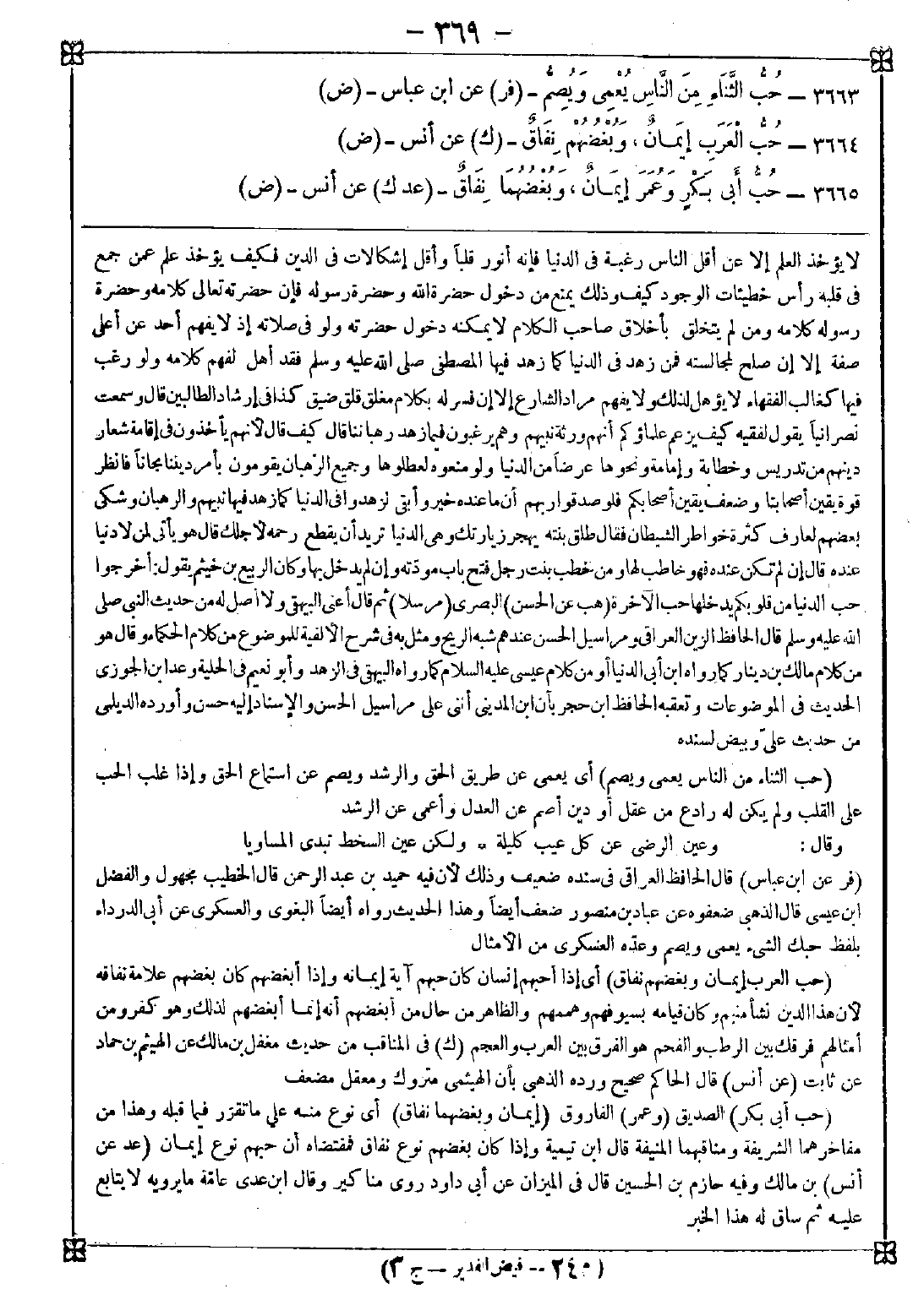 3664 - (حب العرب إيمان وبغضهم نفاق) أي إذا أحبهم كان حبهم آية إيمانهم وإذا أبغضهم كان بغضهم علامة نفاقه لأن هذا الدين نشأ منهم وكان قيامه بسيوفهم وهممهم والظاهر من حال من أبغضهم أنه إنما أبغضهم لذلك وهو كفر ومن أمثالهم فرقك بين الرطب والفحم هو الفرق بين العرب والعجم