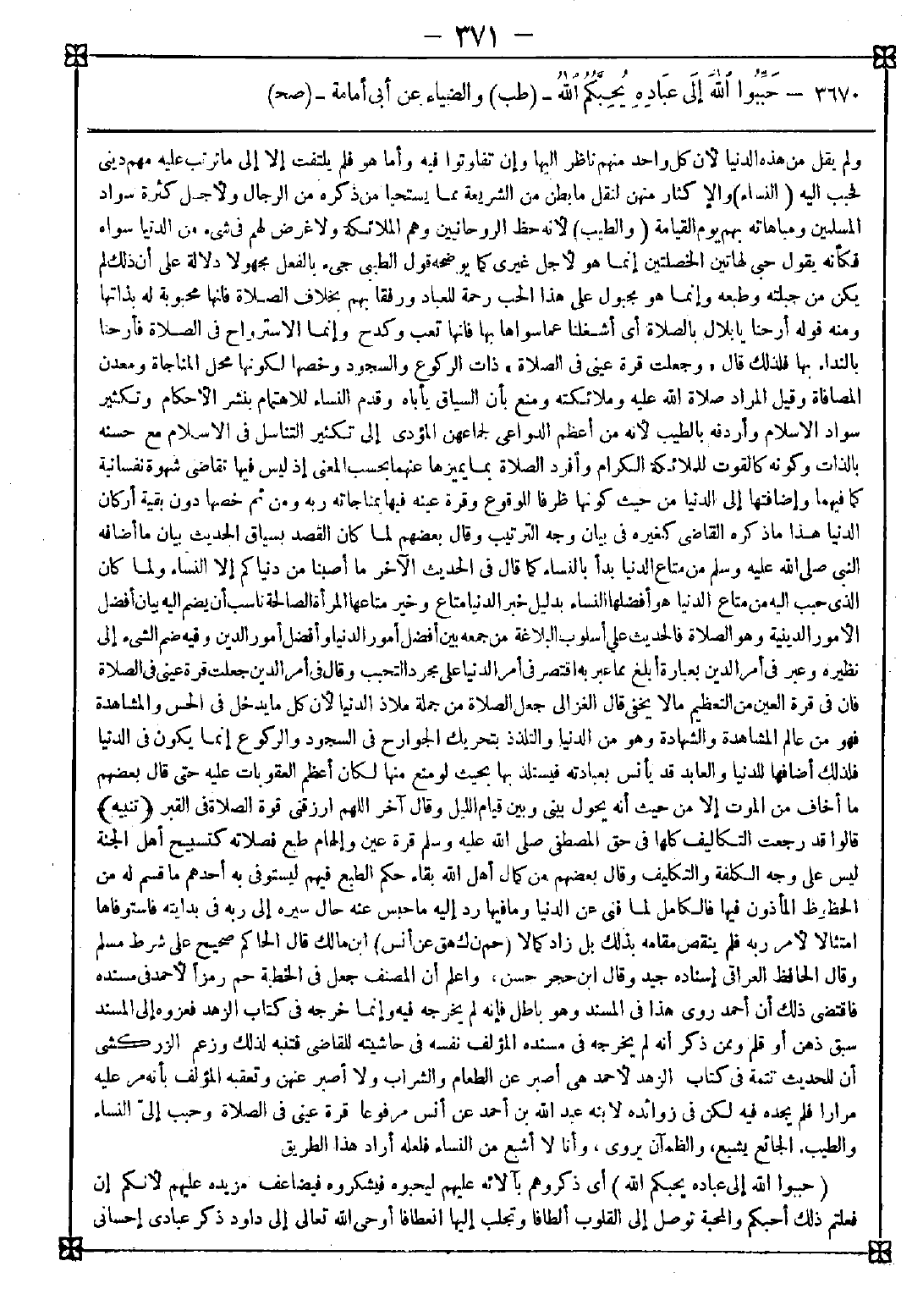 3670 - (حببوا الله إلى عباده يحبكم الله) أي ذكروهم بآلائه عليهم ليحبوه فيشكروه فيضاعف مزيده عليهم لأنكم إن فعلتم ذلك أحبكم والمحبة توصل إلى القلوب ألطافا وتجلب إليها انعطافا أوحى الله تعالى إلى داود ذكر عبادي إحساني -[372]- إليهم ليحبوني فإن عبادي لا يحبون إلا من أحسن إليهم (1) . <فائدة> قال المحقق الصفدي: محبة العبد إلى ربه قسمان أحدهما ينشأ عن مشاهدة الإحسان ومطالعة الآلاء والنعم فإن القلوب جبلت على حب من أحسن إليها ولا إحسان أعظم من إحسان الرب