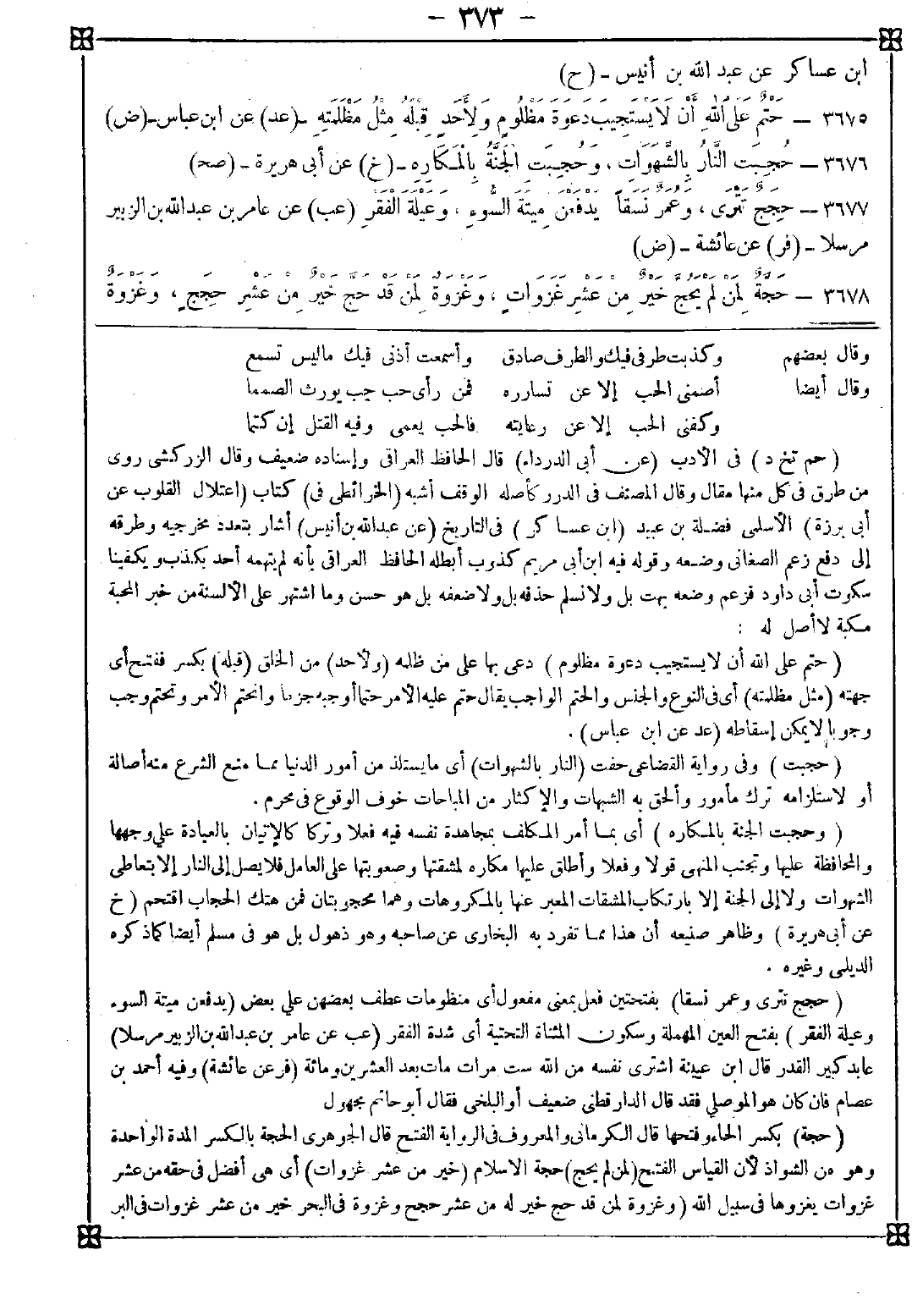 3677 - (حجج تترى وعمر نسقا) بفتحتين فعل بمعنى مفعول أي منظومات عطف بعضهن على بعض (يدفعن ميتة السوء وعيلة الفقر) بفتح العين المهملة وسكون المثناة التحتية أي شدة الفقر