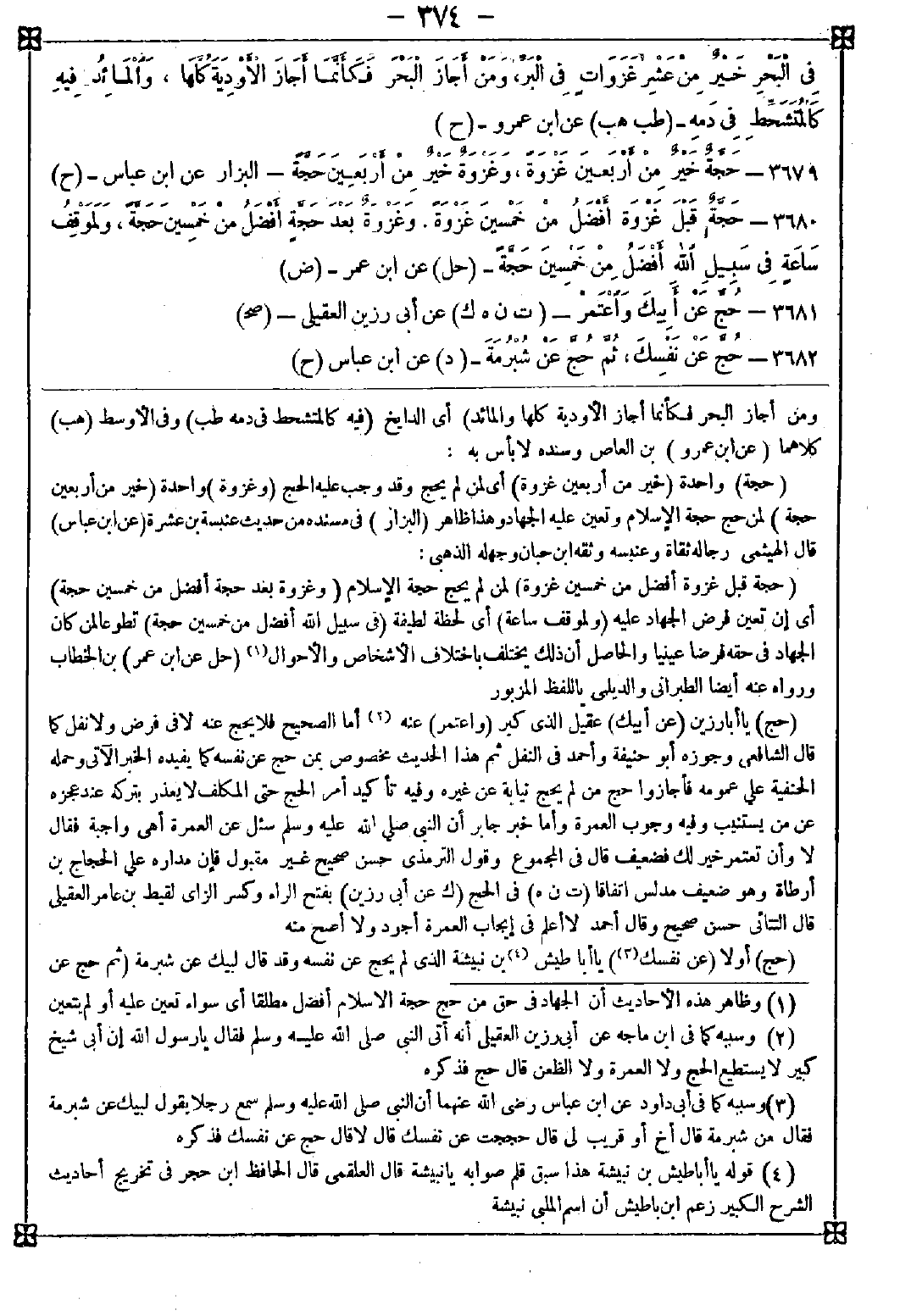 3682 - (حج) أولا (عن نفسك) (1) يا أبا طيش (2) بن نبيشة الذي لم يحج عن نفسه وقد قال لبيك عن شبرمة (ثم حج عن -[375]- شبرمة) بشين معجمة مضمومة فموحدة ساكنة فراء مضمومة ومن قال شبرمنت فقد صحف وحرف وفيه أنه لا يصح ممن عليه حج واجب الحج عن غيره وكذا العمرة فإن أحرم عن غيره وقع عن نفسه وعليه الشافعي وصححه أبو حنيفة ومالك والحديث حجة عليهما والجمهور على كراهة إجازة الإنسان نفسه للحج لكن حمل على منع قصد الدنيا أما بقصد الآخرة لاحتياجه للأجرة ليصرفها في واجب أو مندوب فلا