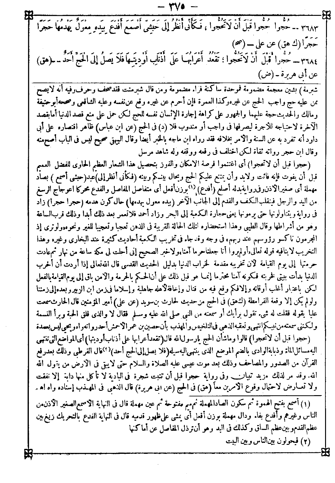 3683 - (حجوا قبل أن لا تحجوا) أي اغتنموا فرصة الإمكان والفوز بتحصيل هذا الشعار العظيم الحاوي للفضل العميم قبل أن يفوت فإنه فائت ولا بد أن يمتنع عليكم الحج ويحال بينكم وبينه (فكأني أنظر إلى) عبد (حبشي أصمع) بصاد مهملة أي صغير الأذن وفي رواية بدله أصلع (أفدع) (1) بوزن أفعل أي متفاصل المفاصل والفدع محركا اعوجاج الرسغ من اليد والرجل فينقلب الكف والقدم إلى الجانب الآخر (بيده معول يهدمها) حال كونه هدمه (حجرا حجرا) زاد في رواية ويتناولونها حتى يرمونها يعني حجارة الكعبة إلى البحر وزاد أحمد فلا تعمر بعد ذلك أبدا وذلك قرب الساعة وهو من أشراطها وقال الطيبي: وهذا استحضاره لتلك الحالة القريبة في الذهن تعجبا وتعجيبا للغير ونحوه {ولو ترى إذ المجرمون ناكسوا رؤوسهم عند ربهم} في وجه وقد جاء في تخريب الكعبة أحاديث كثيرة عند البخاري وغيره وهذا التخريب لا ينافيه قوله تعالى {أولم يروا أنا جعلنا حرما آمنا} ولا خبر الصحيح إني أحلت لي مكة ساعة من نهار ثم عادت حرمتها إلى يوم القيامة لأن تخريبه مقدمة لخراب الدنيا بدليل الحديث القدسي قال الله تعالى: إذا أردت أن أخرب الدنيا بدأت ببيتي فخربته فكونه آمنا محترما إنما هو قبل ذلك على أن الحكم بالحرمة والأمن باق إلى يوم القيامة بالفعل لكن باعتبار أغلب أوقاته وإلا فكم وقع فيه من قتال وإخافة لأهله جاهلية وإسلاما في زمن ابن الزبير وبعده إلى زمننا ولو لم يكن إلا وقعة القرامطة