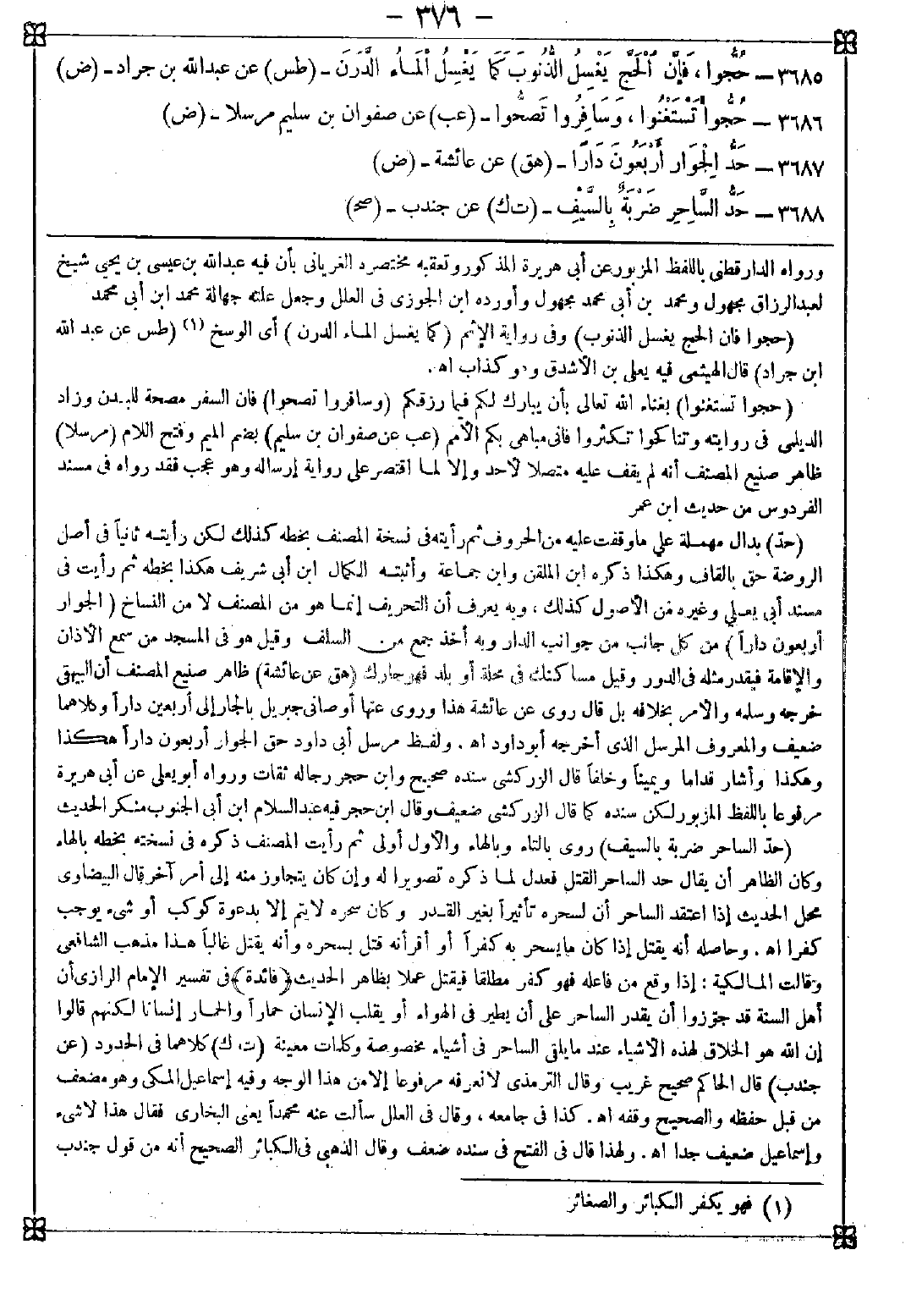 3688 - (حد الساحر ضربة بالسيف) روي بالتاء وبالهاء والأول أولى ثم رأيت المصنف ذكره في نسخته بخطه بالهاء وكان الظاهر أن يقال حد الساحر القتل فعدل لما ذكره تصويرا له وإن كان يتجاوز منه إلى أمر آخر قال البيضاوي: محل الحديث إذا اعتقد الساحر أن لسحره تأثيرا بغير القدر وكان سحره لا يتم إلا بدعوة كوكب أو شيء يوجب كفرا اه. وحاصله أنه يقتل إذا كان ما يسحر به كفرا أو أقر أنه قتل بسحره وأنه يقتل غالبا هذا مذهب الشافعي وقالت المالكية: إذا وقع من فاعله فهو كفر مطلقا فيقتل عملا بظاهر الحديث. <فائدة> في تفسير الإمام الرازي أن أهل السنة قد جوزوا أن يقدر الساحر على أن يطير في الهواء أو يقلب الإنسان حمارا والحمار إنسانا لكنهم قالوا إن الله هو الخلاق لهذه الأشياء عند ما يلقي الساحر في أشياء مخصوصة وكلمات معينة