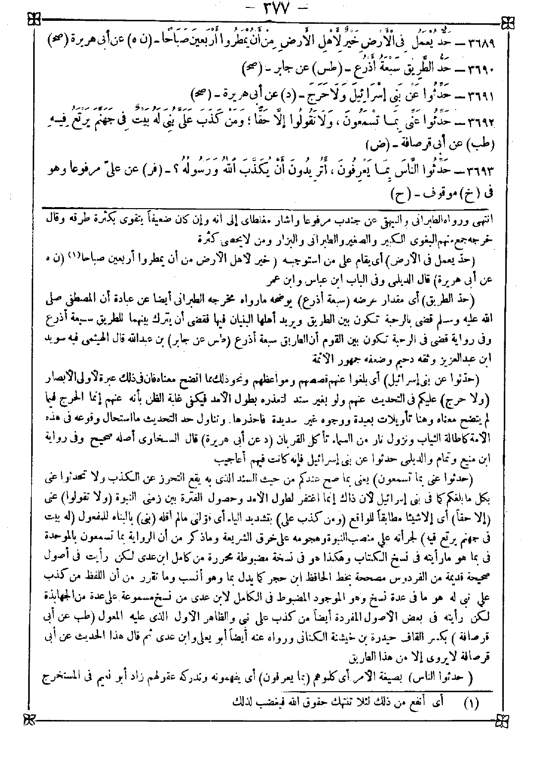 3691 - (حدثوا عن بني إسرائيل) أي بلغوا عنهم قصصهم ومواعظهم ونحو ذلك مما اتضح معناه فإن في ذلك عبرة لأولي الأبصار (ولا حرج) عليكم في التحديث عنهم ولو بغير سند لتعذره بطول الأمد فيكفي غلبة الظن بأنه عنهم إنما الحرج فيما لم يتضح معناه وهنا تأويلات بعيدة ووجوه غير سديدة فاحذرها. وتناول حد التحديث ما استحال وقوعه في هذه الأمة كإطالة الثياب ونزول نار من السكاء تأكل القربان