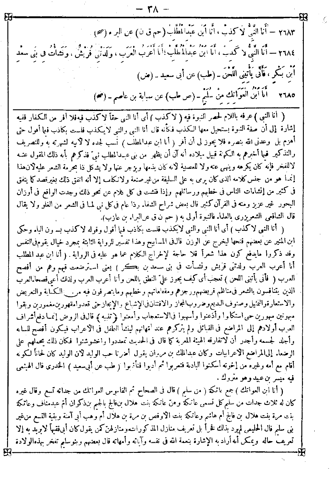 -[38]- 2683 - (أنا النبي) عرفه باللام لحصر النبوة فيه (لا كذب) أي أنا النبي حقا لا كذب فيه فلا أفر من الكفار ففيه إشارة إلى أن صفة النبوة يستحيل معها الكذب فكأنه قال أنا النبي والنبي لا يكذب فلست بكاذب فيما أقول حتى أهزم بل وعدني الله بنصره فلا يجوز لي أن أفر (أنا ابن عبد المطلب) نسب لجده لا لأبيه لشهرته به وللتصريف والتذكير فيما أخبرهم به الكهنة قبيل ميلاده أنه آن أن يظهر من بني عبد المطلب نبي فذكرهم بأنه ذلك المقول عنه لا للفخر فإنه كان يكرهه وينهى عنه ولا للعصبية لأنه كان يذمها ويزجر عنها ولا يشكل ذا بحرمة الشعر عليه لأن هذا إنما هو من جنس كلامه الذي كان يرمي به على السليقة من غير صنعة ولا تكلف إلا أنه اتفق ذلك بغير قصد كما يتفق في كثير من إنشاءات الناس في خطبهم ورسائلهم وإذا فتشت في كل كلام عن نحو ذلك وجدت الواقع في أوزان البحور غير عزيز ومنه في القرآن كثير. قال بعض شراح الشفاء: وذا عام في كل نبي لما في الشعر من الغلو ولا يقال قال الشافعي الشعر يزري بالعلماء فالنبوة أولى به
