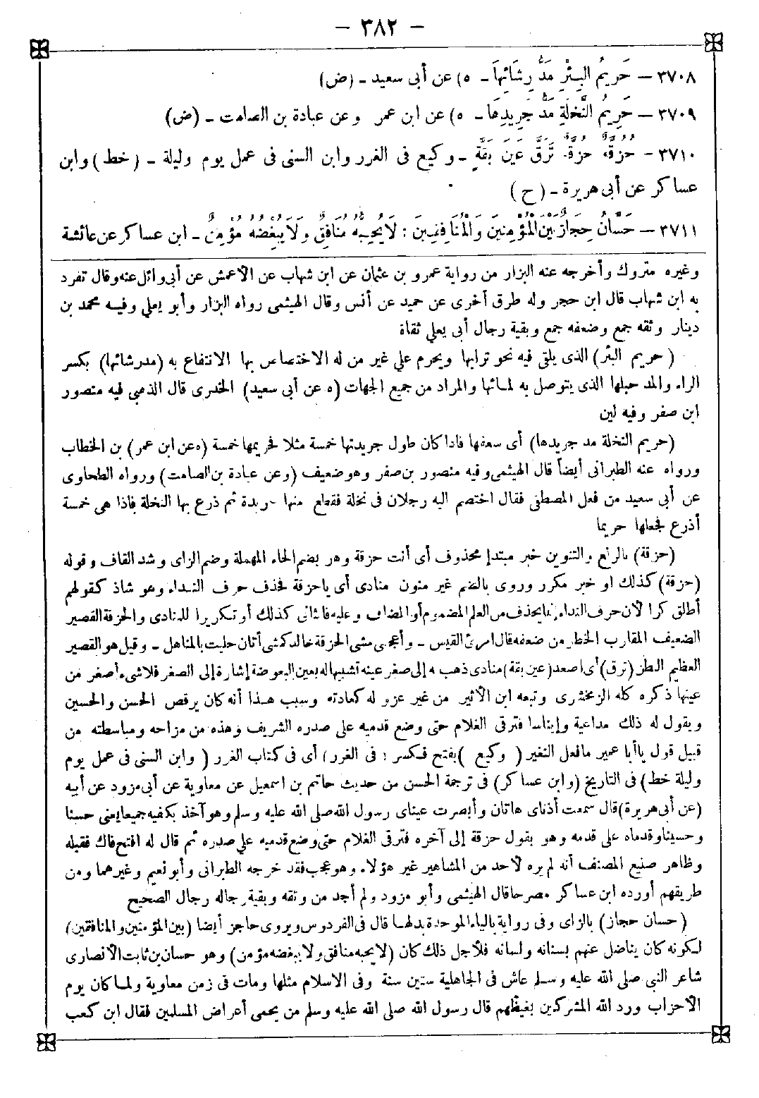 3711 - (حسان حجاز) بالزاي وفي رواية بالياء الموحدة بدلها قال في الفردوس: ويروى حاجز أيضا (بين المؤمنين والمنافقين) لكونه كان يناضل عنهم بسنانه ولسانه فلأجل ذلك كان (لا يحبه منافق ولا يبغضه مؤمن) وهو حسان بن ثابت الأنصاري شاعر النبي صلى الله عليه وسلم عاش في الجاهلية ستين سنة وفي الإسلام مثلها ومات في زمن معاوية ولما كان يوم الأحزاب ورد الله المشركين بغيظهم قال رسول الله صلى الله عليه وسلم: من يحمي أعراض المسلمين فقال ابن كعب: -[383]- أنا وقال ابن رواحة: أنا وقال حسان: أنا فقال: نعم هجهم أنت وسيعينك عليهم روح القدس