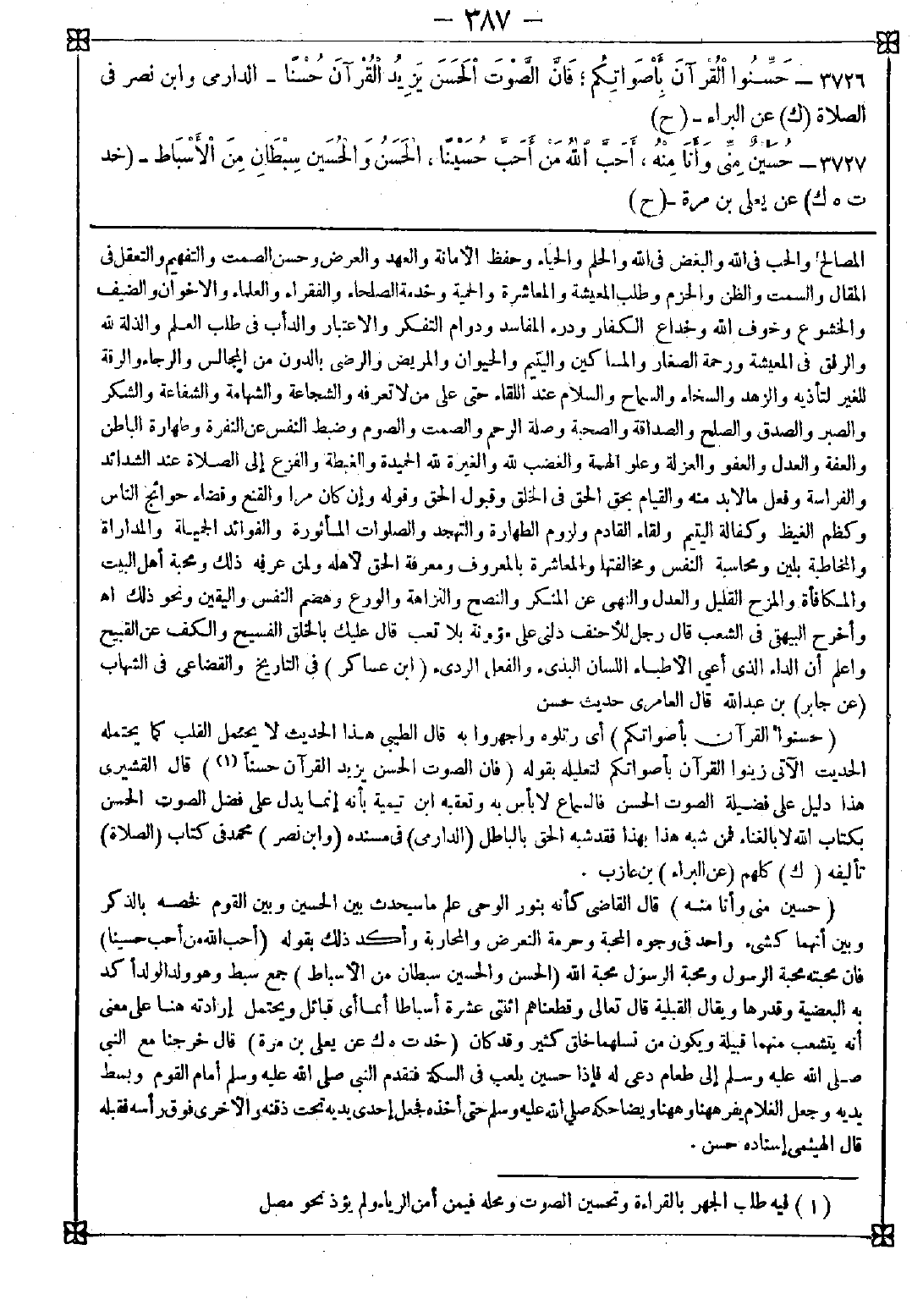 3726 - (حسنوا القرآن بأصواتكم) أي رتلوه واجهروا به قال الطيبي: هذا الحديث لا يحتمل القلب كما يحتمله الحديث الاتي زينوا القرآن بأصواتكم لتعليله بقوله (فإن الصوت الحسن يزيد القرآن حسنا (1)) قال القشيري: هذا دليل على فضيلة الصوت الحسن فالسماع لا بأس به وتعقبه ابن تيمية بأنه إنما يدل على فضل الصوت الحسن بكتاب الله لا بالغناء فمن شبه هذا بهذا فقد شبه الحق بالباطل