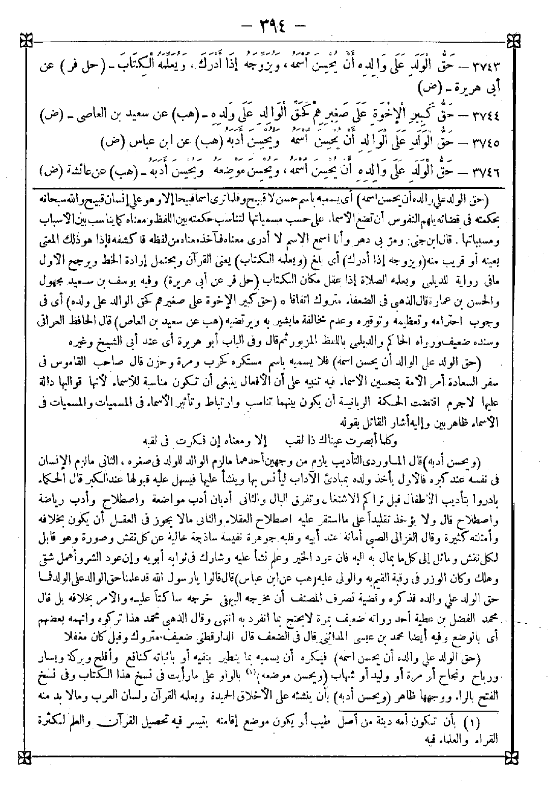 -[394]- 3743 - (حق الولد على والده أن يحسن اسمه) أي يسميه باسم حسن لا قبيح وقلما ترى اسما قبيحا إلا وهو على إنسان قبيح والله سبحانه بحكمته في قضائه يلهم النفوس أن تضع الأسماء على حسب مسمياتها لتناسب حكمته بين اللفظ ومعناه كما يناسب بين الأسباب ومسبباتها. قال ابن جني: ومر بي دهر وأنا أسمع الاسم لا أدري معناه فآخذ معناه من لفظه فأكشفه فإذا هو ذلك المعنى بعينه أو قريب منه (ويزوجه إذا أدرك) أي بلغ (ويعلمه الكتاب) يعني القرآن ويحتمل إرادة الخط ويرجح الأول ما في رواية للديلمي ويعلمه الصلاة إذا عقل مكان الكتاب